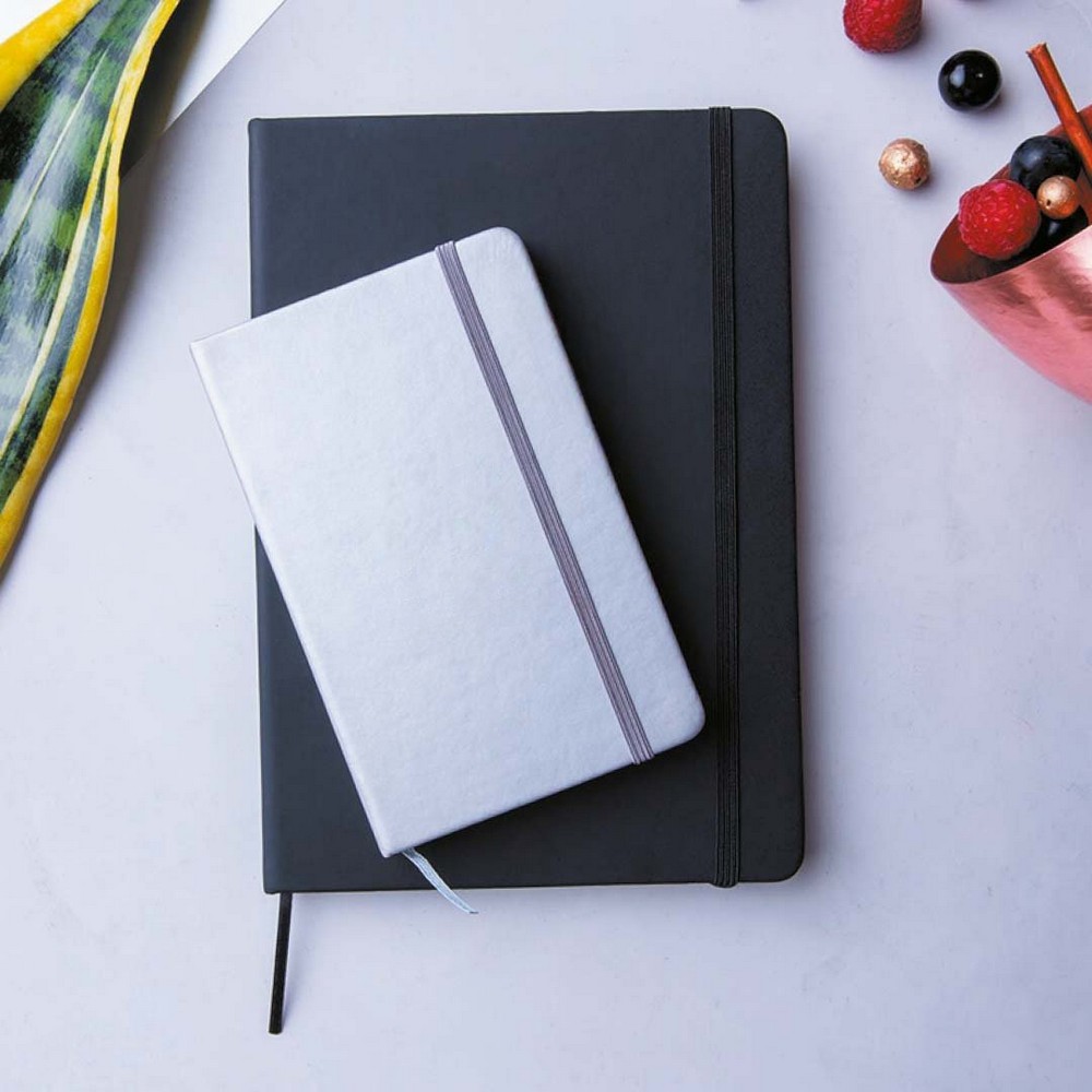 Notatnik w formacie A5, posiada 100 pustych kartek, twarda okładka, tasiemka zakładkowa umożliwia wygodne zaznaczanie ostatniej strony lub ważniejszych notatek, dodatkowe zamknięcie w postaci dopasowanej kolorystycznie elastycznej opaski, produkt wykonany z PU