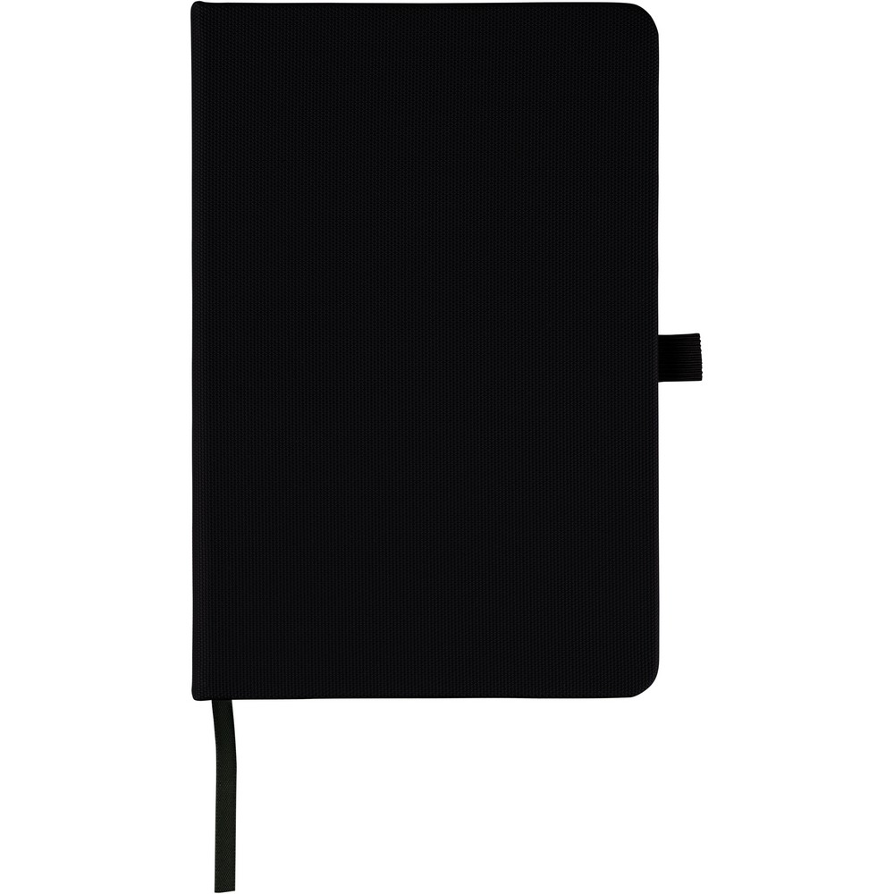 Notatnik w formacie A5, 70 g/m², posiada 70 kartek w linie, tasiemka zakładkowa umożliwia wygodne zaznaczanie ostatniej strony lub ważniejszych notatek, dodatkowe zamknięcie w postaci dopasowanej kolorystycznie elastycznej opaski, sznurek do przywiązania długopisu, ikona recyklingu z tyłu, produkt wykonany z RPET 600D i papieru