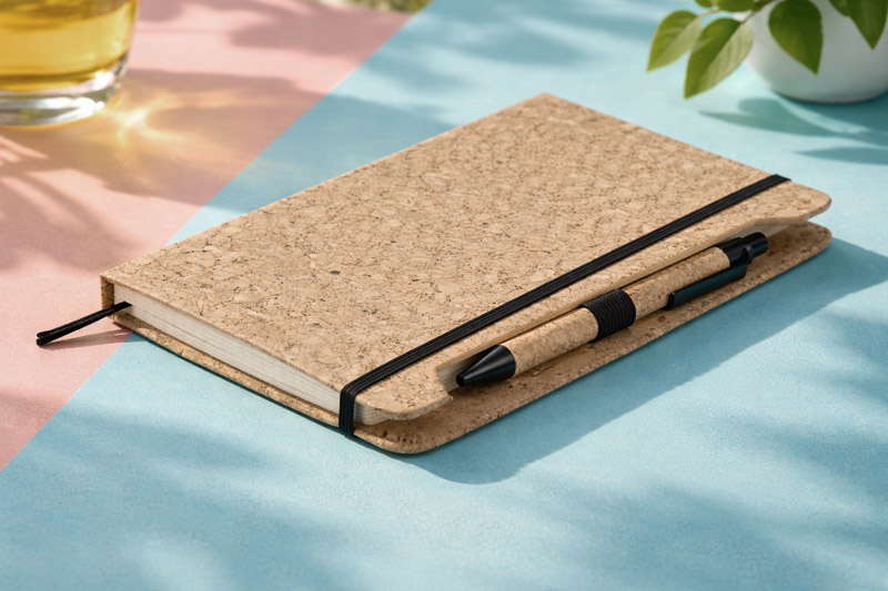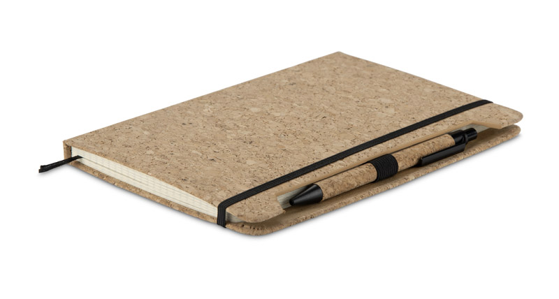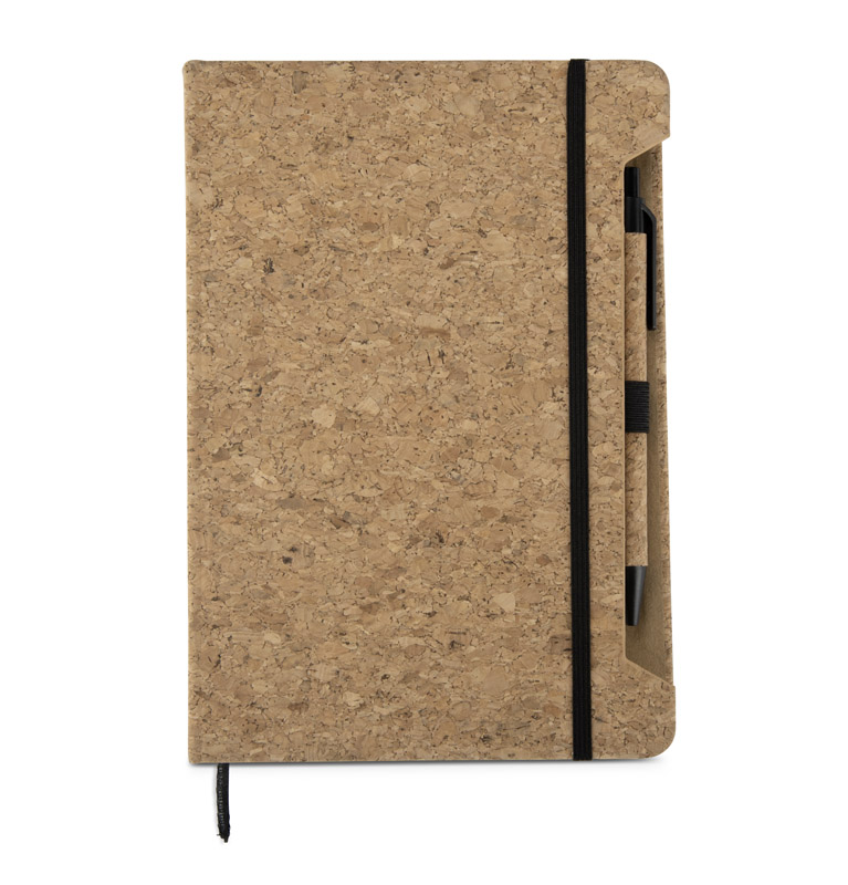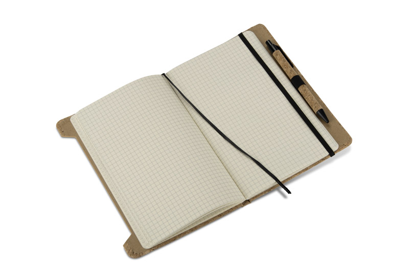 Notes SKRIP A5 przyciąga uwagę okładką z naturalnego korka o wyraźnej, organicznej fakturze. W zestawie znajduje się długopis wykonany częściowo z tego samego materiału, co tworzy spójną i efektowną całość. Wewnątrz znajduje się 80 białych kartek w kratkę (gramatura 70 g/m²), a całość zabezpieczona jest elastyczną gumką. Notes jest szyty, co zapewnia komfort podczas użytkowania i otwierania na płasko. Funkcjonalny i stylowy – doskonały do zestawów promocyjnych lub
