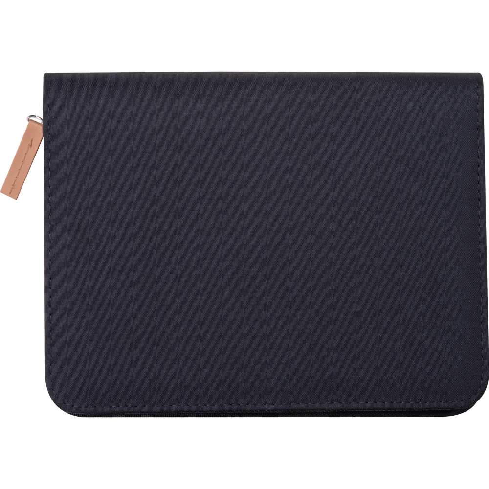 Teczka A5 z poliestru z recyklingu z zamkiem błyskawicznym i wyjmowanym notesem (144 strony z papieru z trzciny cukrowej) to praktyczny i elegancki gadżet. Idealna jako reklamowa teczka z nadrukiem full color, sprawdza się jako gadżety reklamowe dla pracownika, studenta i gadżety reklamowe do biura.