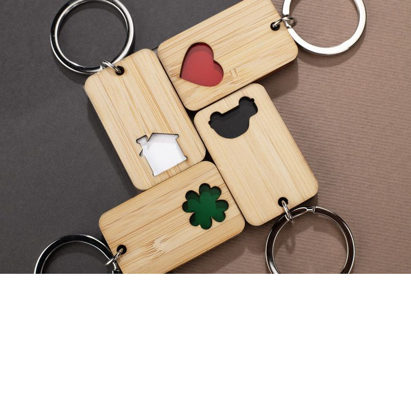 Brelok CARVE z wysokiej jakości bambusa wyróżnia się precyzyjnie wyciętym, kolorowym motywem (dom, samochód, serce, koniczyna). Trwały, estetyczny i lekki, z możliwością personalizacji logo, idealnie sprawdzi się jako gadżet reklamowy, upominek firmowy lub elegancki dodatek do kluczy, torby czy plecaka.