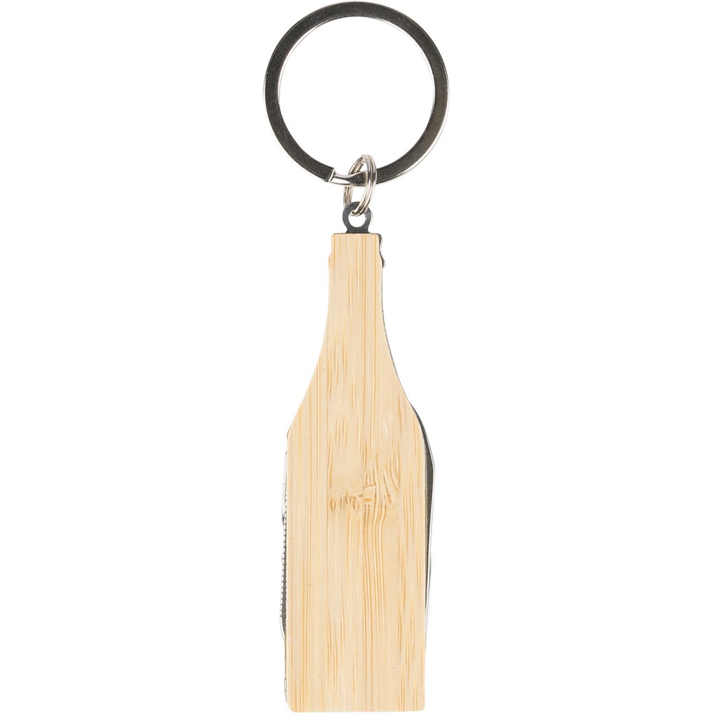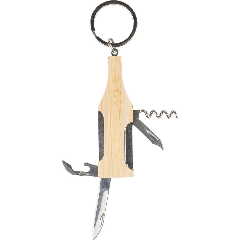 Brelok, narzędzie wielofunkcyjne zawiera: otwieracz do butelek, korkociąg pilnik do paznokci, scyzoryk, zapakowany pojedynczo w brązowy kartonik, produkt wykonany ze stali nierdzewnej 420 i bambusa