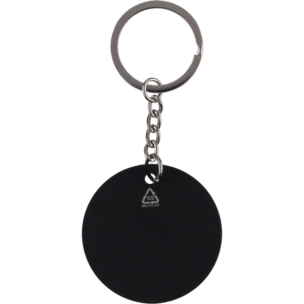 Okrągły brelok do kluczy, ikona recyklingu na produkcie, zapakowany w kraftową kopertę, produkt wykonany ze stali nierdzewnej z recyklingu