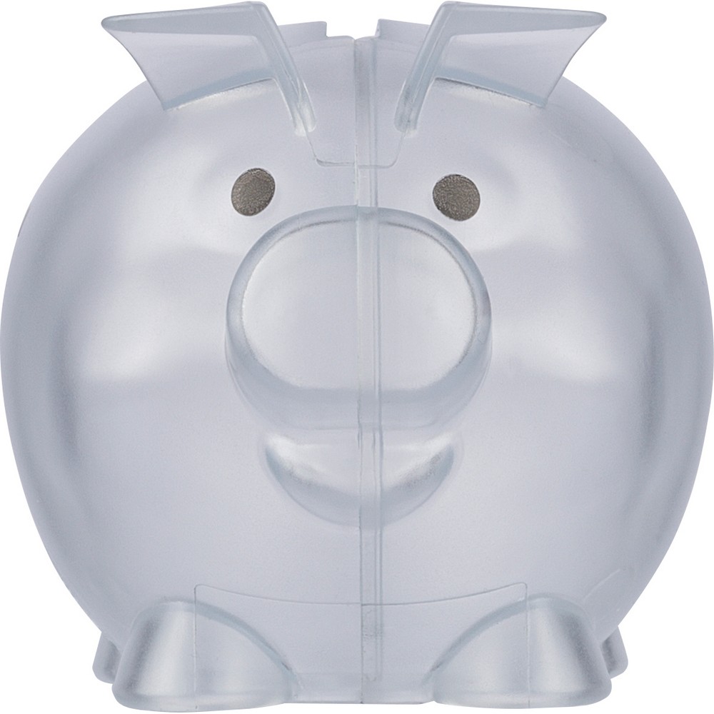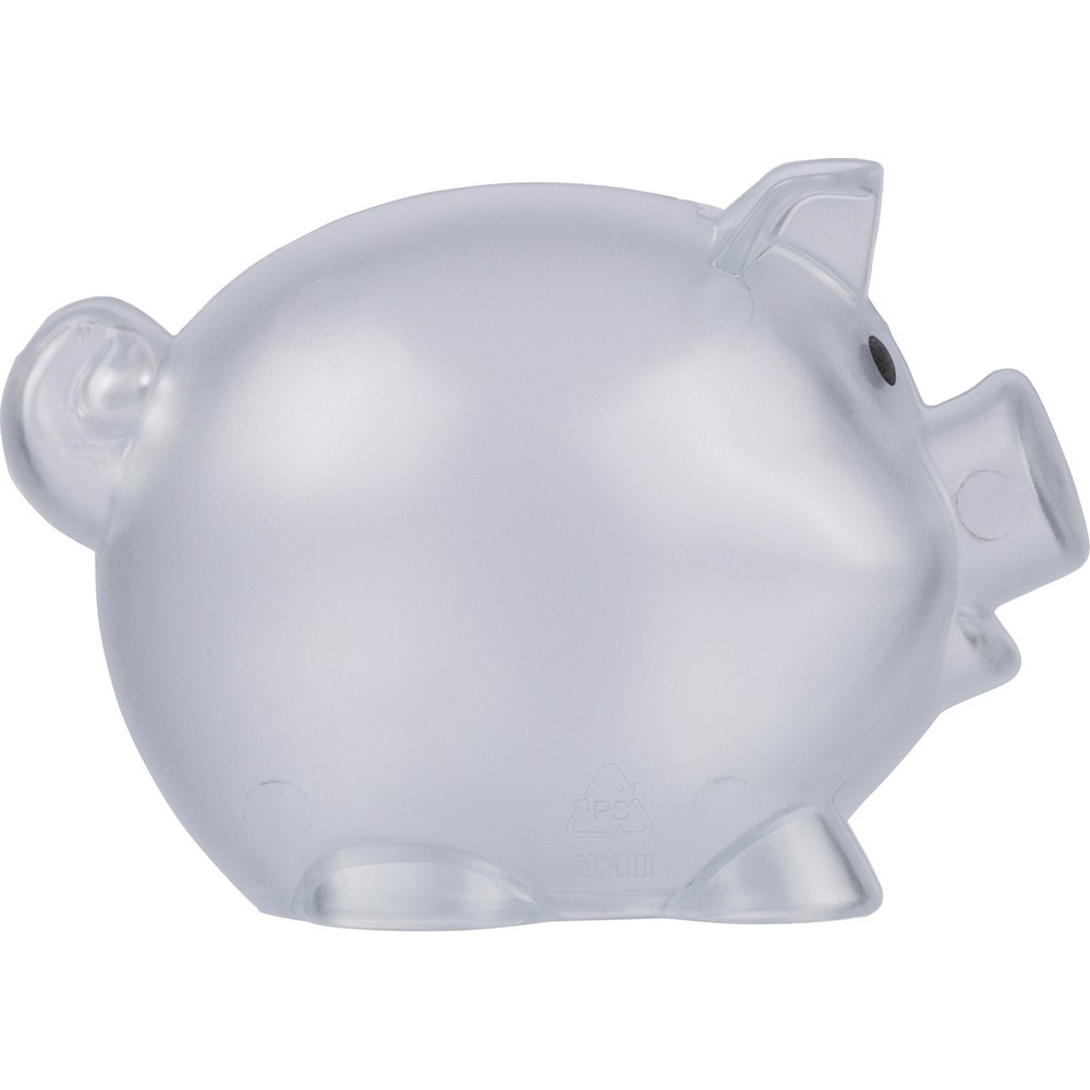 Skarbonka "świnka", ikona recyklingu na produkcie, zapakowany w woreczek foliowy z recyklingu, produkt wykonany z plastiku z recyklingu