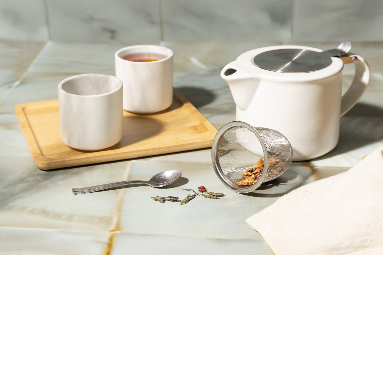 Zestaw do herbaty łączy w sobie nowoczesny design z klasyczną elegancją. Matowa ceramika i naturalny bambus nadają całości wyrafinowanego charakteru, a minimalistyczny styl sprawia, że pasuje do każdego wnętrza – od nowoczesnego biura, przez przytulny salon, po klasyczną kuchnię.