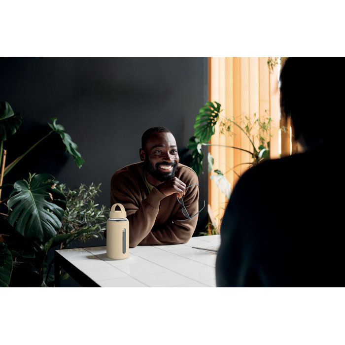 Szklana konstrukcja nadaje produktowi elegancji i wyrafinowanego wyglądu. Przezroczyste szkło pozwala kontrolować poziom napoju, co jest wygodne podczas aktywności fizycznej. W połączeniu z silikonowym pokrowcem i pokrywką tworzy praktyczny i estetyczny gadżet, który sprawdzi się jako prezent reklamowy.