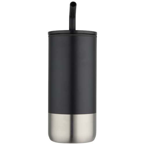 Ten kubek termiczny o podwójnych ściankach jest wyposażony w słomkę ze stali nierdzewnej z recyklingu, zakończoną silikonową końcówką zapewniającą wygodę użytkowania. Wewnętrzna ścianka jest wykonana z polipropylenu, a ścianka zewnętrzna ze stali nierdzewnej z recyklingu z certyfikatem RCS. Przesuwana pokrywa wykonana z tworzywa PS i plastiku ABS w połączeniu z matową powłoką nadaje kubkowi eleganckie wykończenie. Pojemność: 480 ml.