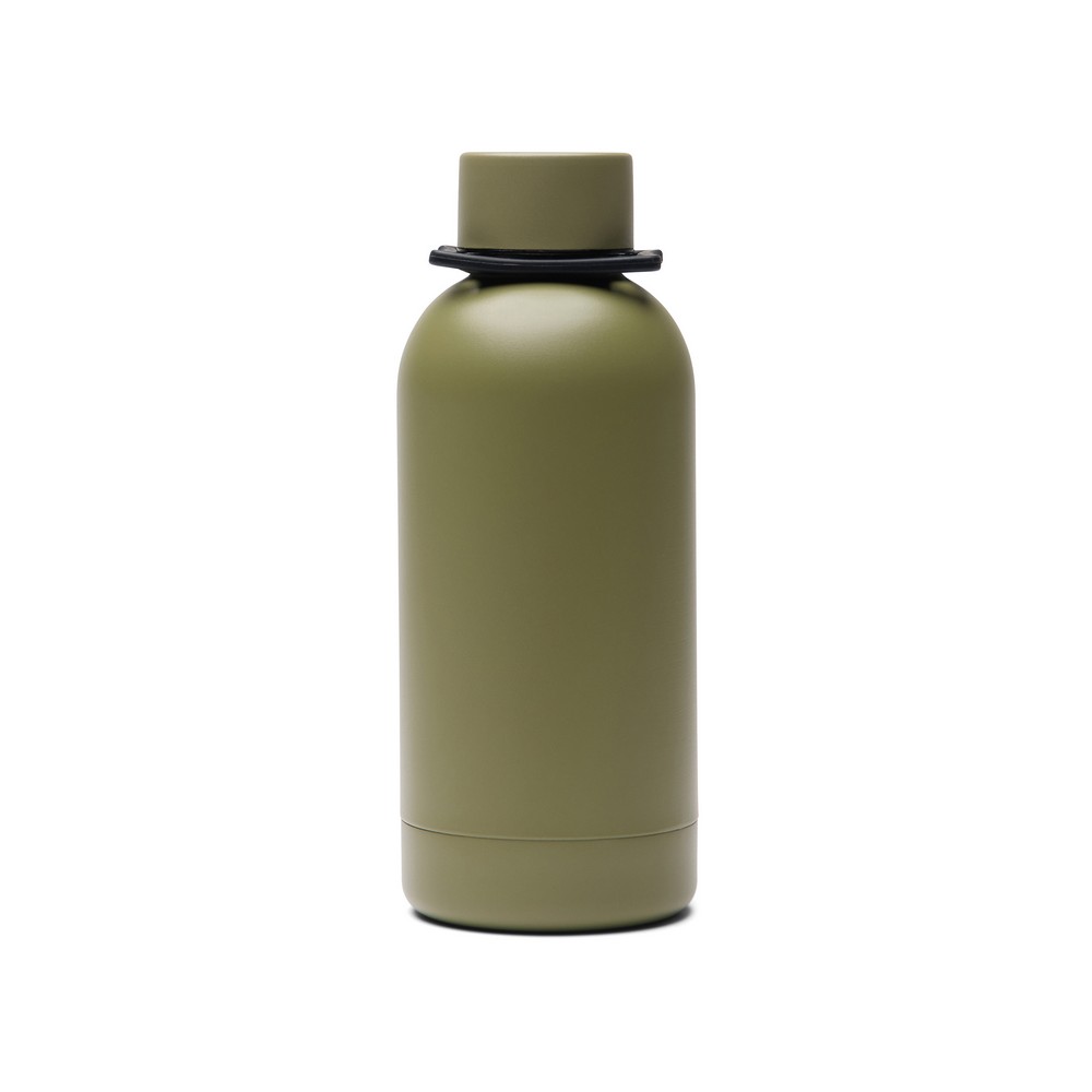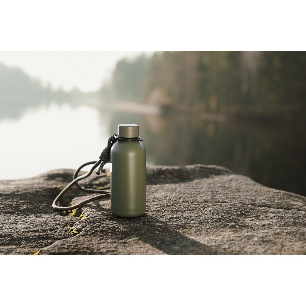 Butelka termiczna 400 ml, posiada podwójne ścianki ze stali nierdzewnej z recyklingu z próżnią między ściankami, co spowalnia oddawanie temperatury na zewnątrz, zachowując funkcje termosu, posiada odpinany pasek do noszenia, wykonana ze stali nierdzewnej z recyklingu, całkowita zawartość materiałów z recyklingu obliczona na podstawie masy całkowitej produktu: 71%