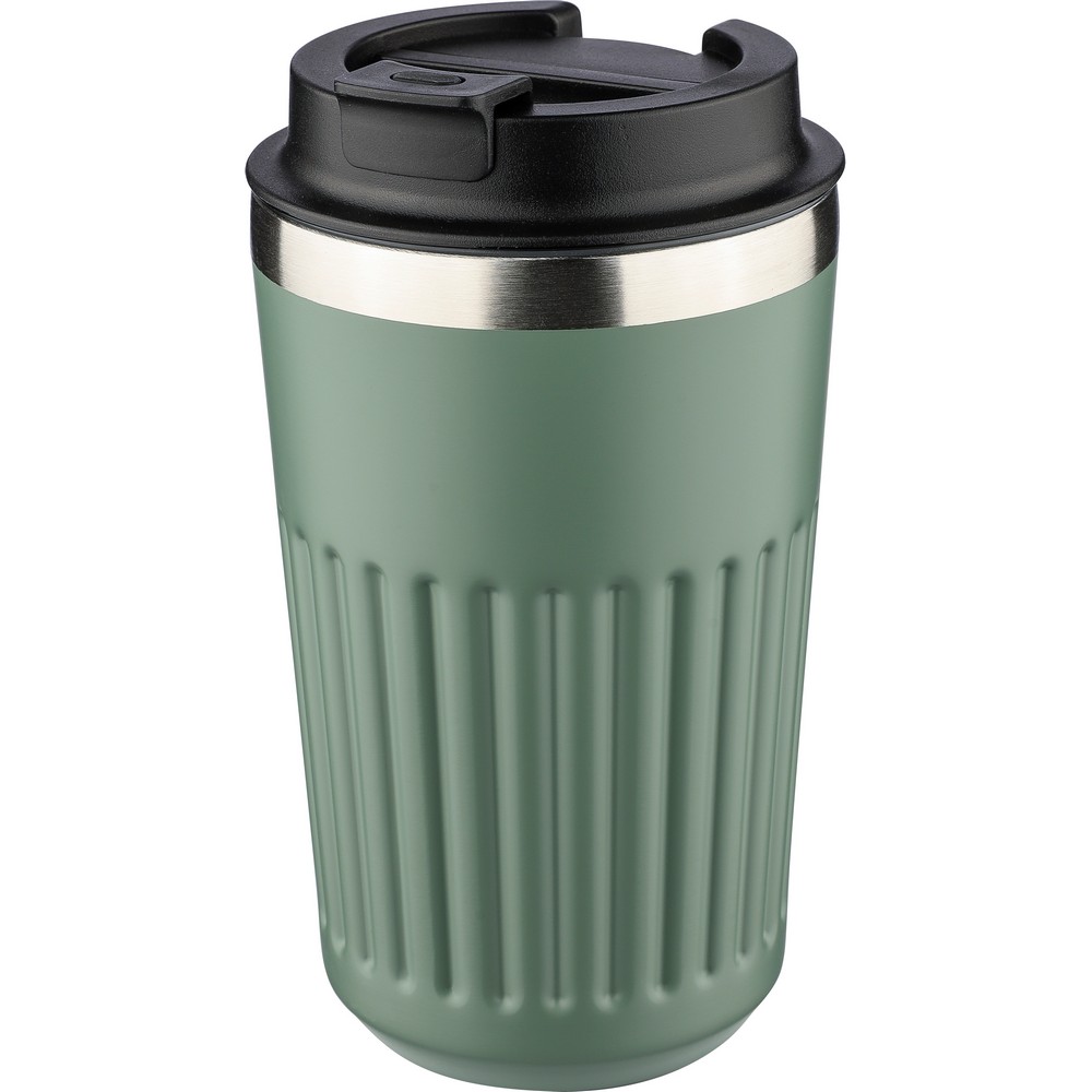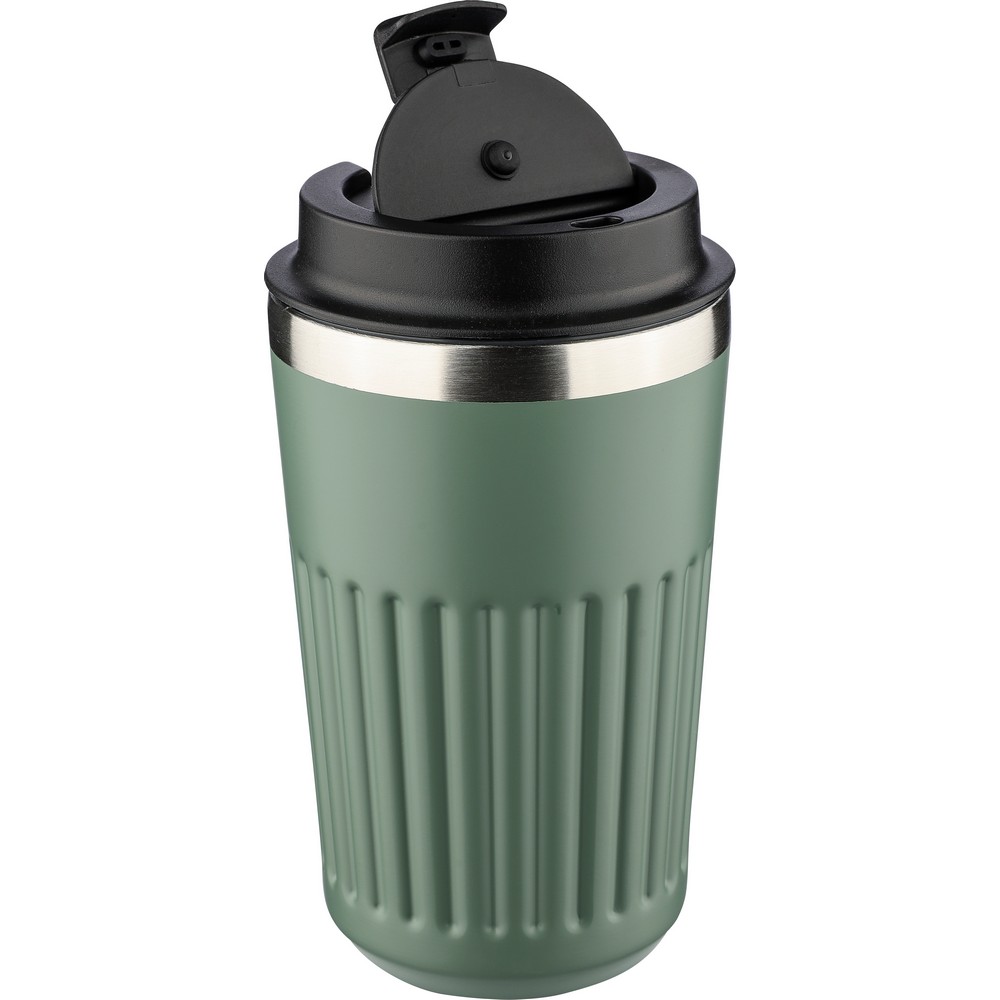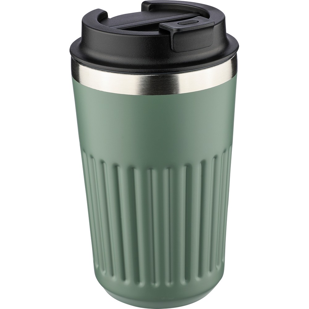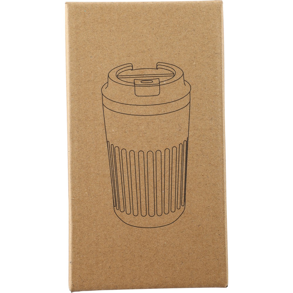 Kubek termiczny 400 ml, posiada podwójne ścianki ze stali nierdzewnej z próżnią między ściankami, co spowalnia oddawanie temperatury na zewnątrz, zachowując funkcje termosu, ikona recyklingu na produkcie, zapakowany w brązowy kartonik, produkt wykonany ze stali nierdzewnej (304 w środku i 201 na zewnątrz), silikonu i PP