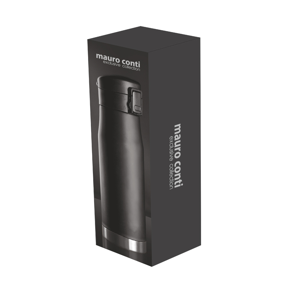 Kubek termiczny 600 ml Mauro Conti, posiada podwójne ścianki ze stali nierdzewnej z miedzianą izolacją próżniową, co spowalnia oddawanie temperatury na zewnątrz, zachowując funkcje termosu, wieczko z blokadą i przyciskiem otwarcia ustnika umożliwiającym obsługę jedną ręką, utrzymuje temperaturę napojów gorących do 15 godzin +leakproof