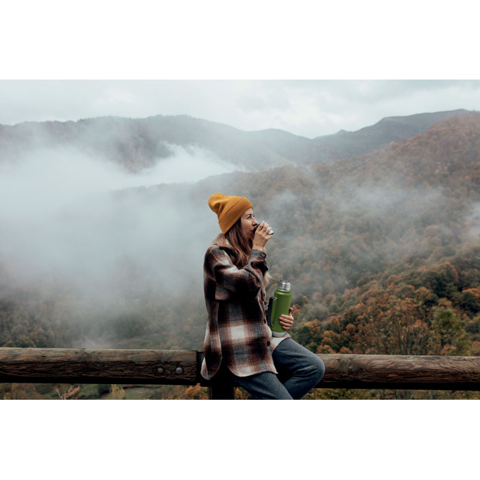 Co więcej, termos posiada kubek wykonany z recyklingowanej stali nierdzewnej. To nie tylko praktyczne rozwiązanie, ale także kolejny element wpisujący się w filozofię eko-designu. Kubek umożliwia wygodne picie w każdych warunkach – w pracy, w podróży czy na łonie natury.