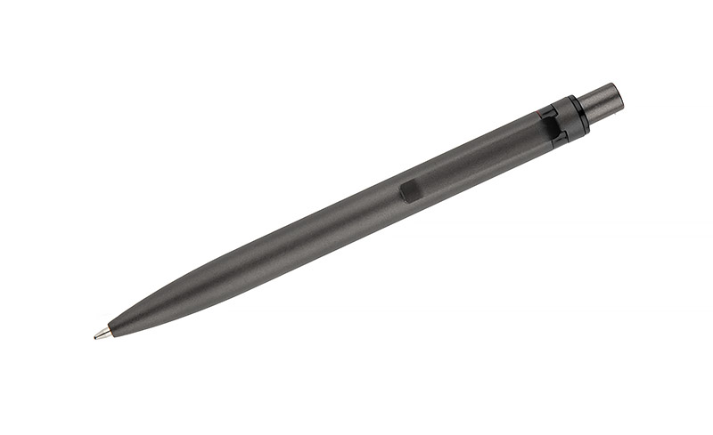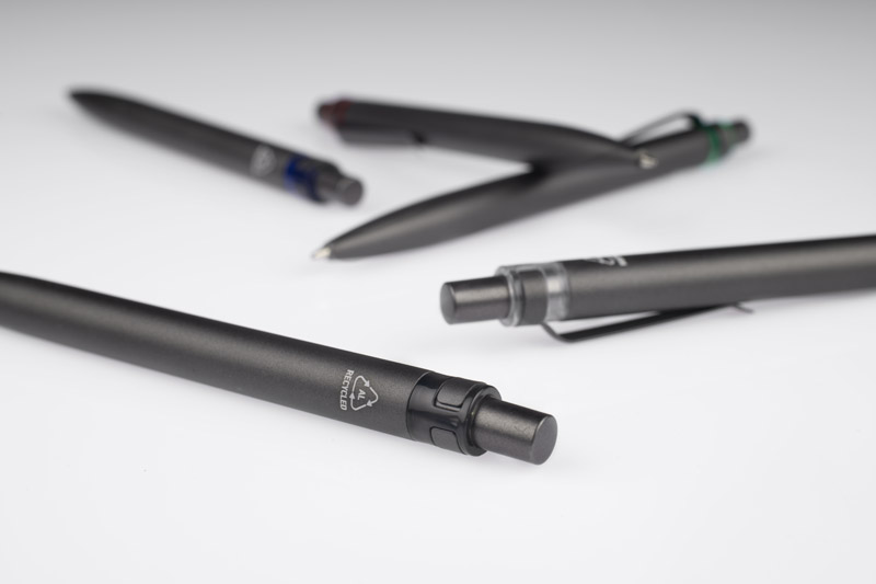 Długopis RAL wykonany jest z recyklingowanego aluminium w eleganckim, grafitowym kolorze z chromowanym wykończeniem. Aluminiowy klips zakończony kolorowym akcentem nadaje mu nowoczesny i rozpoznawalny wygląd. Mechanizm wysuwu jest automatyczny, co zapewnia wygodę i szybkie użycie w każdej sytuacji. Smukła forma oraz przyjemny w dotyku korpus gwarantują komfort pisania. Wkład typu G2 o grubości linii 1,0 mm zapewnia płynny i precyzyjny zapis. To praktyczny gadżet reklamowy, który ś