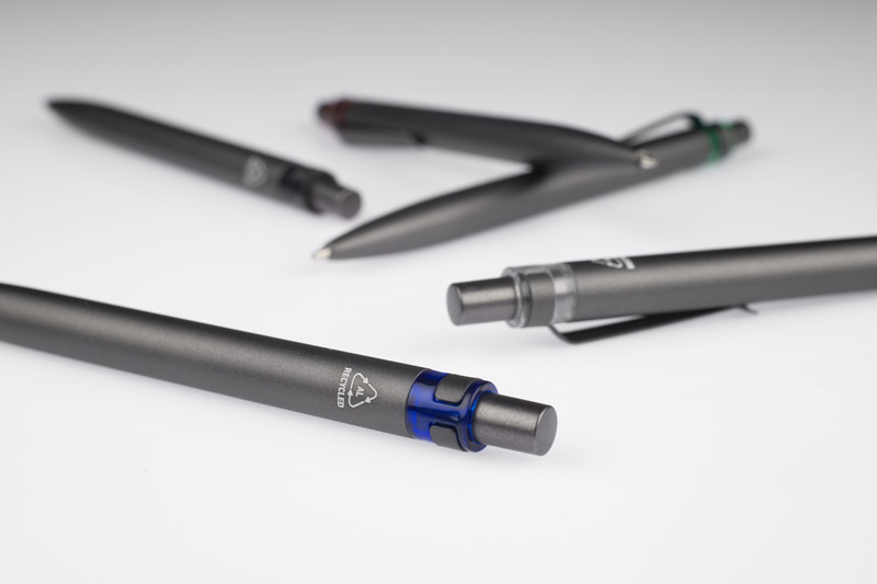 Długopis RAL wykonany jest z recyklingowanego aluminium w eleganckim, grafitowym kolorze z chromowanym wykończeniem. Aluminiowy klips zakończony kolorowym akcentem nadaje mu nowoczesny i rozpoznawalny wygląd. Mechanizm wysuwu jest automatyczny, co zapewnia wygodę i szybkie użycie w każdej sytuacji. Smukła forma oraz przyjemny w dotyku korpus gwarantują komfort pisania. Wkład typu G2 o grubości linii 1,0 mm zapewnia płynny i precyzyjny zapis. To praktyczny gadżet reklamowy, który ś