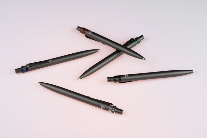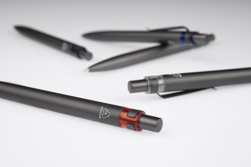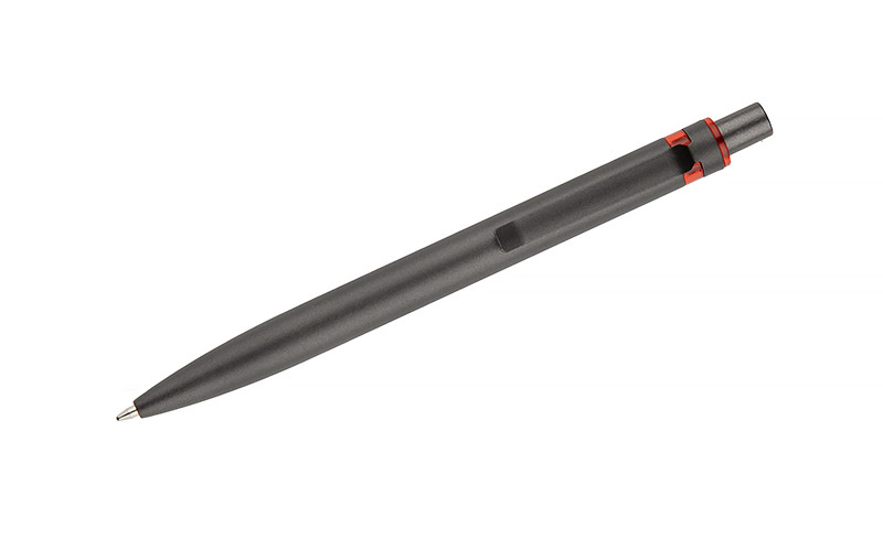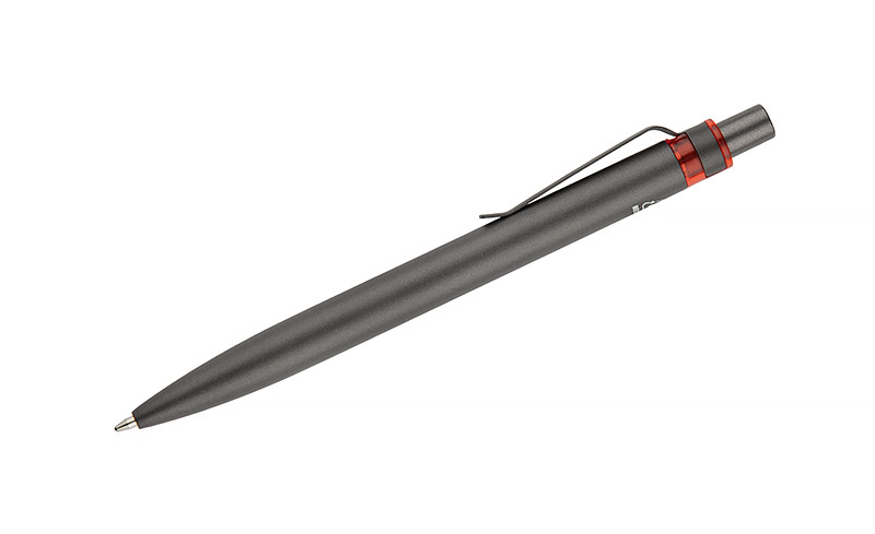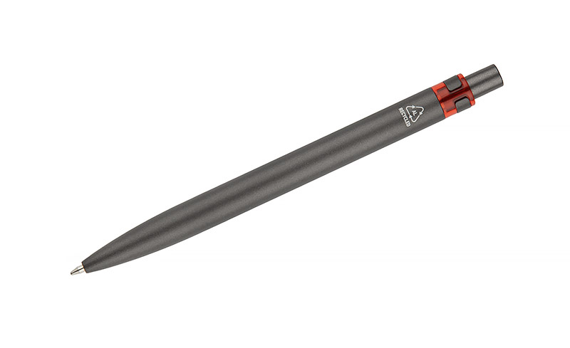 Długopis RAL wykonany jest z recyklingowanego aluminium w eleganckim, grafitowym kolorze z chromowanym wykończeniem. Aluminiowy klips zakończony kolorowym akcentem nadaje mu nowoczesny i rozpoznawalny wygląd. Mechanizm wysuwu jest automatyczny, co zapewnia wygodę i szybkie użycie w każdej sytuacji. Smukła forma oraz przyjemny w dotyku korpus gwarantują komfort pisania. Wkład typu G2 o grubości linii 1,0 mm zapewnia płynny i precyzyjny zapis. To praktyczny gadżet reklamowy, który ś
