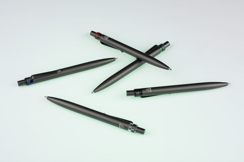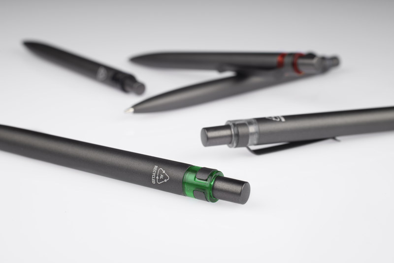 Długopis RAL wykonany jest z recyklingowanego aluminium w eleganckim, grafitowym kolorze z chromowanym wykończeniem. Aluminiowy klips zakończony kolorowym akcentem nadaje mu nowoczesny i rozpoznawalny wygląd. Mechanizm wysuwu jest automatyczny, co zapewnia wygodę i szybkie użycie w każdej sytuacji. Smukła forma oraz przyjemny w dotyku korpus gwarantują komfort pisania. Wkład typu G2 o grubości linii 1,0 mm zapewnia płynny i precyzyjny zapis. To praktyczny gadżet reklamowy, który ś