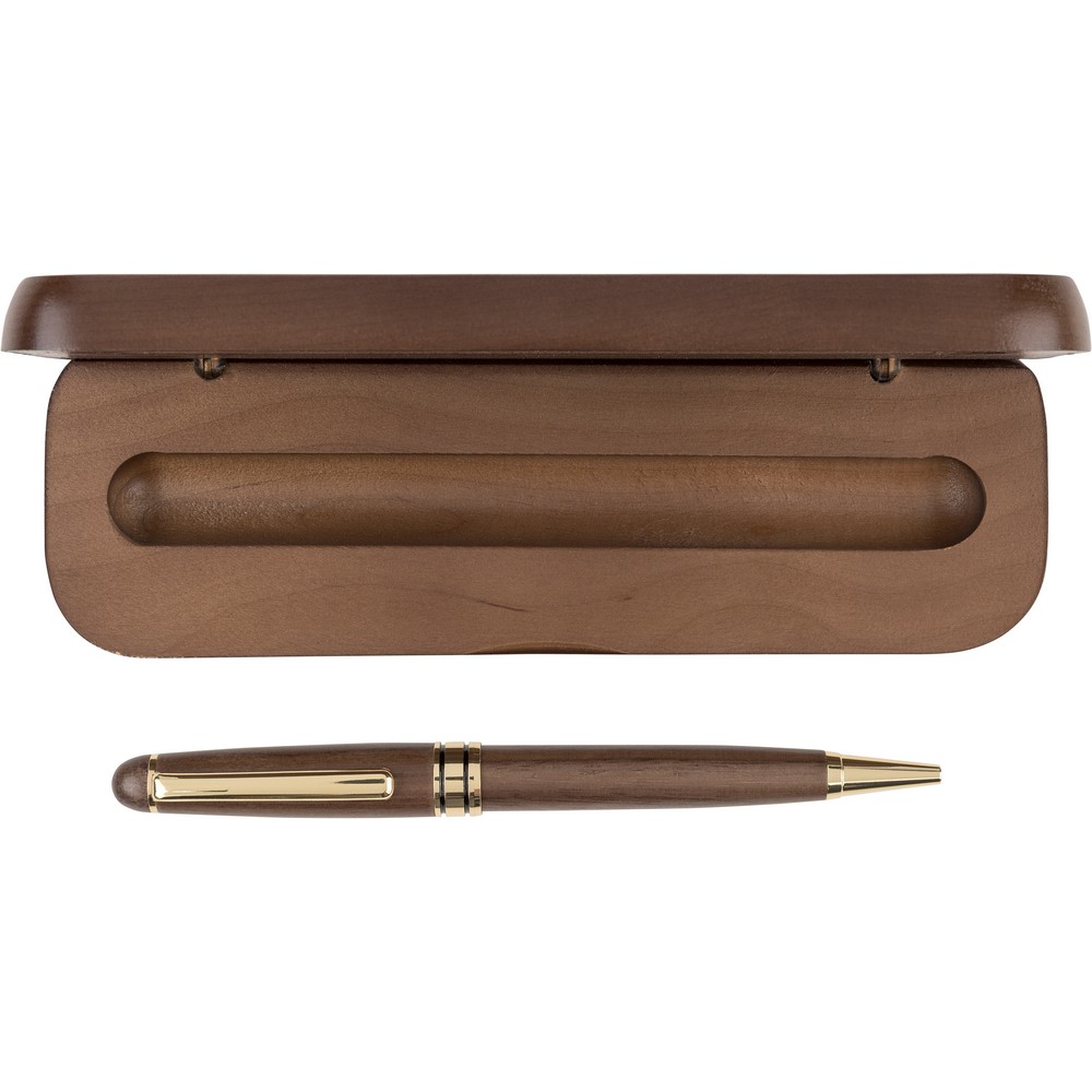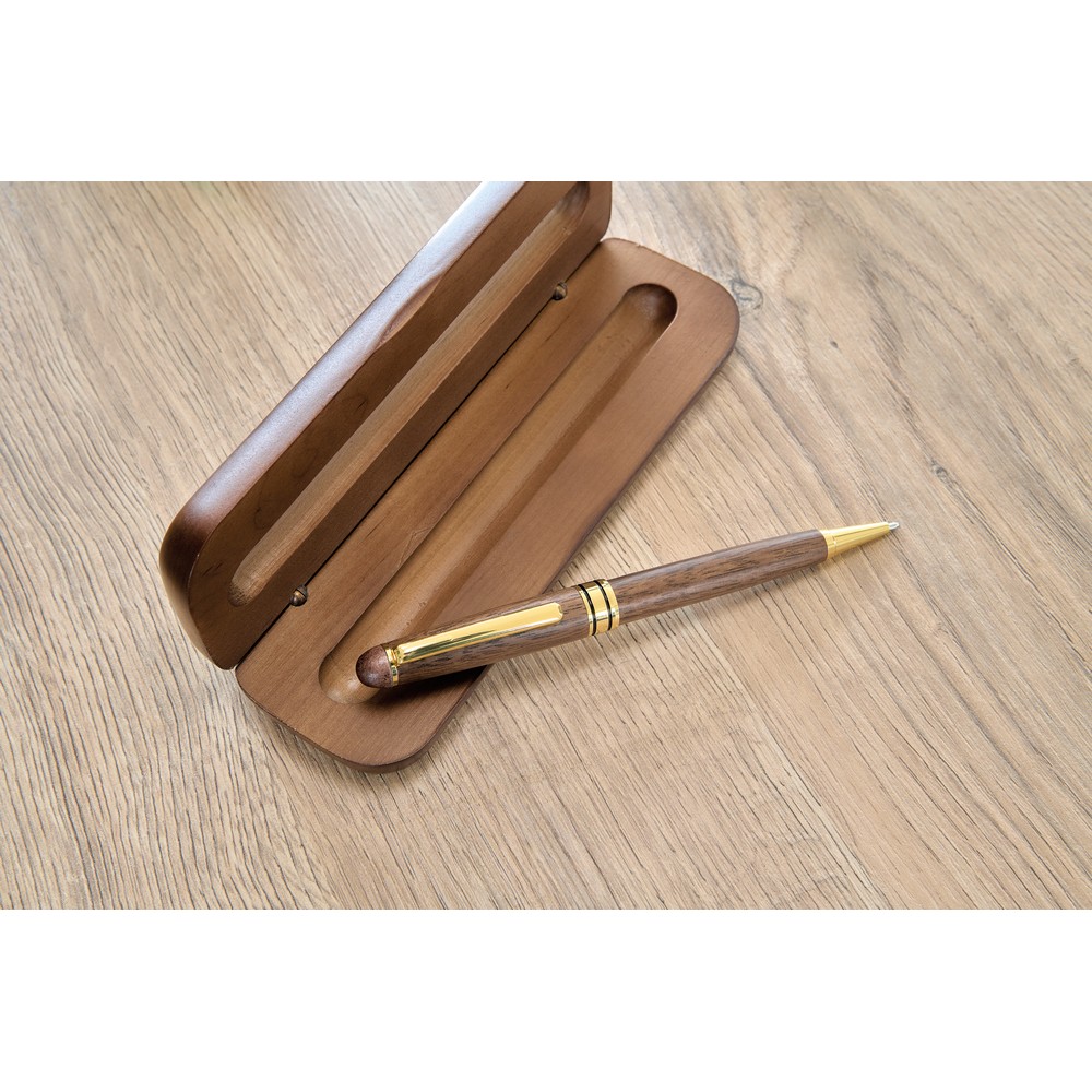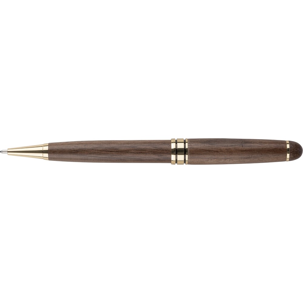 Długopis przekręcany, wkład w niebieskim kolorze wystarcza na ok. 1000 m pisania, zapakowany w brązowy kartonik, produkt wykonany z drewna orzecha włoskiego