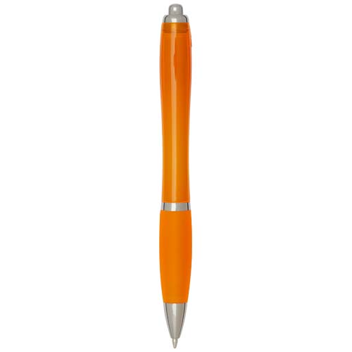 Długopis kulkowy Nash z mechanizmem klikania, wykonany z tworzyw sztucznych pochodzących z recyklingu, charakteryzuje się stylowym, zakrzywionym designem z przezroczystym, kolorowym korpusem ze srebrnymi wykończeniami i dopasowanym kolorystycznie miękkim uchwytem zapewniającym wygodę pisania. Wykonany z plastiku ABS z recyklingu z certyfikatem RCS, przyczynia się do ograniczenia zużycia surowców pierwotnych, zachowując jednocześnie trwałość. Z tyłu umieszczono logo rABS, podkreś