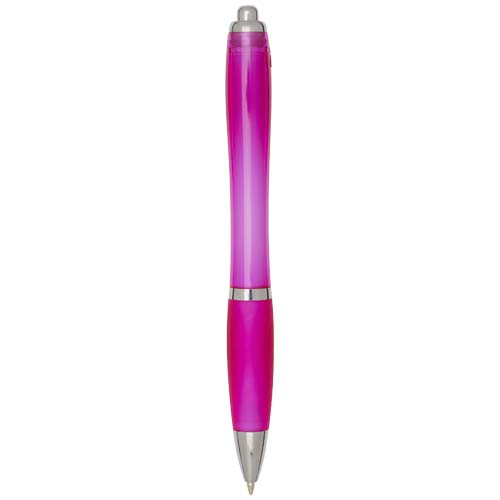Długopis kulkowy Nash z mechanizmem klikania, wykonany z tworzyw sztucznych pochodzących z recyklingu, charakteryzuje się stylowym, zakrzywionym designem z przezroczystym, kolorowym korpusem ze srebrnymi wykończeniami i dopasowanym kolorystycznie miękkim uchwytem zapewniającym wygodę pisania. Wykonany z plastiku ABS z recyklingu z certyfikatem RCS, przyczynia się do ograniczenia zużycia surowców pierwotnych, zachowując jednocześnie trwałość. Z tyłu umieszczono logo rABS, podkreś