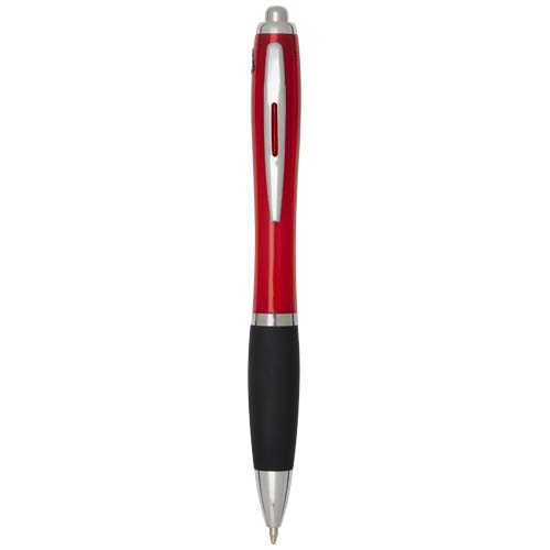 Długopis kulkowy Nash z tworzyw sztucznych pochodzących z recyklingu, z mechanizmem klikania, charakteryzuje się stylowym, zakrzywionym designem z przezroczystym, kolorowym korpusem, srebrnymi wykończeniami i czarnym, miękkim w dotyku uchwytem zapewniającym wygodę pisania. Wykonany z plastiku ABS pochodzącego z recyklingu z certyfikatem RCS, przyczynia się do ograniczenia zużycia surowców pierwotnych, zachowując jednocześnie trwałość. Z tyłu umieszczono logo rABS, podkreślając