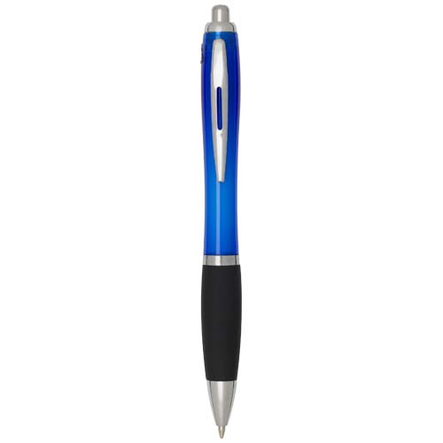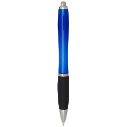 Długopis kulkowy Nash z tworzyw sztucznych pochodzących z recyklingu, z mechanizmem klikania, charakteryzuje się stylowym, zakrzywionym designem z przezroczystym, kolorowym korpusem, srebrnymi wykończeniami i czarnym, miękkim w dotyku uchwytem zapewniającym wygodę pisania. Wykonany z plastiku ABS pochodzącego z recyklingu z certyfikatem RCS, przyczynia się do ograniczenia zużycia surowców pierwotnych, zachowując jednocześnie trwałość. Z tyłu umieszczono logo rABS, podkreślając