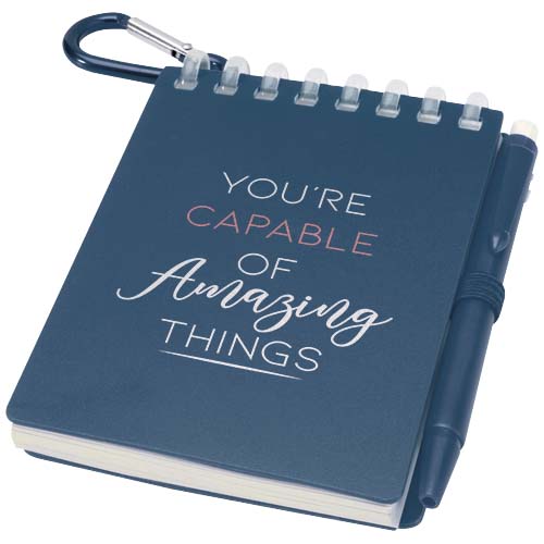 Lig zestaw mini notatnika oraz długopisu to kompaktowe i praktyczne rozwiązanie do robienia notatek w podróży. Notatnik w oprawie spiralnej ma miękką okładkę z recyklingowanego plastiku i 70 czystych kartek z papieru kamiennego o gramaturze 120 g/m², odpornego na działanie wody, dzięki czemu idealnie nadaje się do użytku na zewnątrz. Dzięki zaokrąglonym narożnikom i wbudowanej pętelce na długopis wpisuje się w trend miniaturyzacji, zachowując jednocześnie funkcjonalność.
