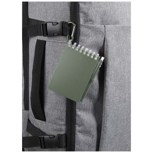 Lig zestaw mini notatnika oraz długopisu to kompaktowe i praktyczne rozwiązanie do robienia notatek w podróży. Notatnik w oprawie spiralnej ma miękką okładkę z recyklingowanego plastiku i 70 czystych kartek z papieru kamiennego o gramaturze 120 g/m², odpornego na działanie wody, dzięki czemu idealnie nadaje się do użytku na zewnątrz. Dzięki zaokrąglonym narożnikom i wbudowanej pętelce na długopis wpisuje się w trend miniaturyzacji, zachowując jednocześnie funkcjonalność.