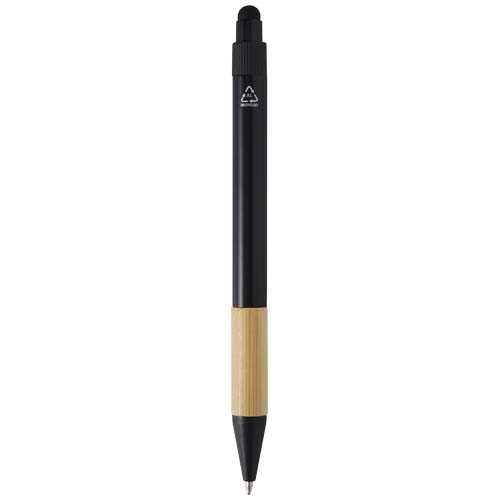 Minka zestaw upominkowy zawierający długopis wykonany z aluminium z recyklingu z certyfikatem RCS ze stylowym uchwytem z bambusa i końcówką w stylu rysika, aluminiowy łańcuch do kluczy (5,5 × 1,8 × 1 cm) z bambusowymi detalami i zintegrowanym uchwytem na telefon oraz ramką na karty RFID (9,7 × 6,2 × 1 cm) z obudową ze stopu aluminium i bambusowymi detalami, zapewniający ochronę dla nawet 10 kart. Długopis z czarnym atramentem pozwala napisać linię o długości 1000 metrów. Prz