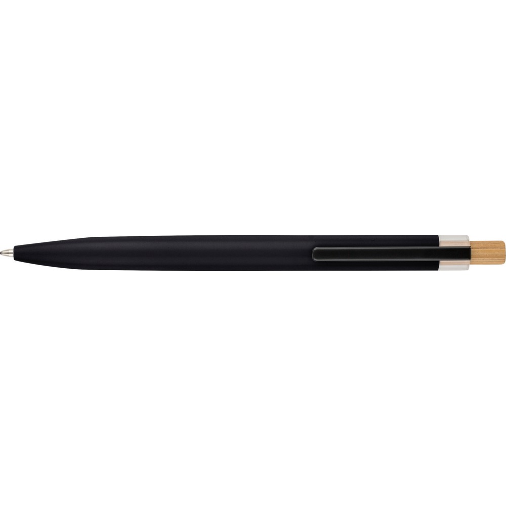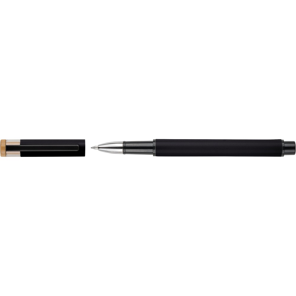 Zestaw piśmienniczy, w którego w skład wchodzi: długopis z bambusowym przyciskiem, ikoną recyklingu na produkcie, metalowym klipsem, tusz w niebieskim kolorze, wystarczający na ok. 700 m pisania, pióro kulkowe z pokrywką, metalowym klipsem, ikoną recyklingu na produkcie, wkład w niebieskim kolorze, wystarczający na ok. 500 m pisania, zapakowany w kolorowe pudełko upominkowe z recyklingu, produkt wykonany z aluminium z recyklingu, RPET i metalu