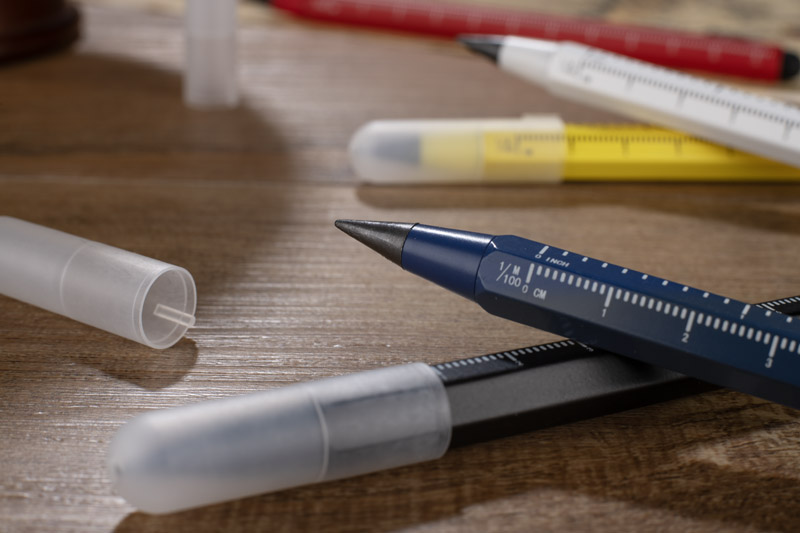 Ołówek wieczny DRAWI to praktyczny gadżet reklamowy wykonany z recyklingowanego aluminium z lakierowanym wykończeniem. Wyposażony w miarkę o długości 11 cm z podziałką w centymetrach i calach oraz touch pen, sprawdzi się w biurze, branży technicznej i budowlanej. Sześciokątny korpus zapewnia wygodny chwyt i zapobiega staczaniu się ołówka ze stołu. Zatyczka z tworzywa chroni końcówkę, co podnosi komfort użytkowania. Kompaktowy format sprawia, że DRAWI jest zawsze pod ręką