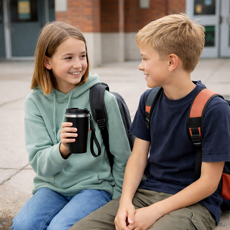 Kubek termiczny SORSO o pojemności 350 ml to praktyczny model zaprojektowany do picia kawy w biegu. Wyposażony w pokrywkę typu flip-top z klapką otwieraną od góry i mechanizmem „podnieś”, umożliwia wygodne korzystanie jedną ręką. Podwójne ścianki pomagają utrzymać temperaturę napoju do 2 godzin, a dołączony uchwyt w formie smyczy ułatwia przenoszenie. Prosta forma i matowe wykończenie sprawiają, że kubek dobrze sprawdza się w codziennym użytkowaniu.