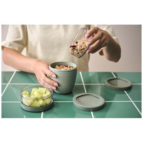 3-częściowy pojemnik na lunch Ellipse posiada trzy oddzielne przegrody, dzięki czemu składniki są zawsze starannie oddzielone. Każdy pojemnik ma własną pokrywkę, która zapobiega mieszaniu się smaków i konsystencji, aż do momentu, gdy zdecydujesz się na spożycie posiłku. Utrzymuje potrawy ciepłe przez 6–8 godzin lub zimne przez 12 godzin. Dwa górne przezroczyste pojemniki mają pojemność 200 ml każdy, natomiast dolny pojemnik ma pojemność 500 ml. Wykonany z trwałych mate