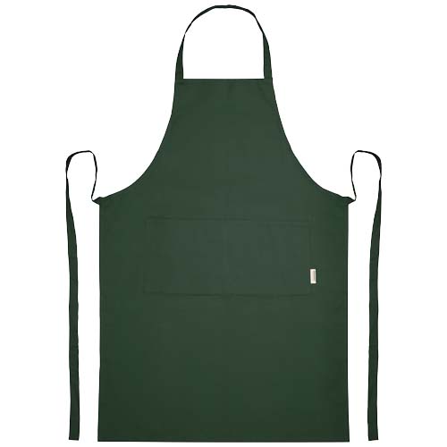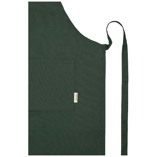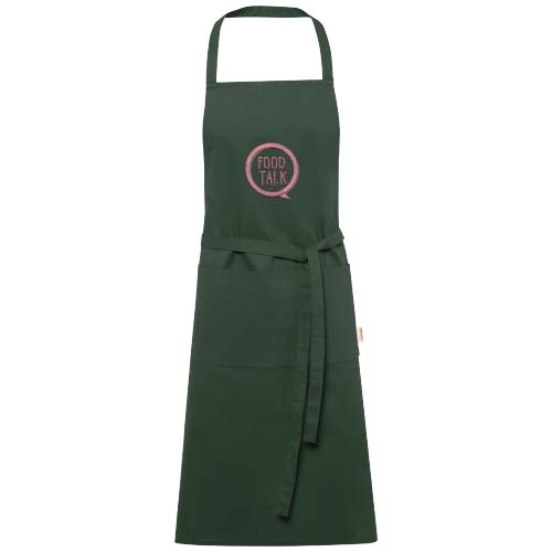 Fartuch wykonany w 100% z certyfikowanej przez OCS bawełny organicznej o gramaturze 200 g/m² pochodzącej z Indii, z 2 umieszczonymi obok siebie kieszeniami o łącznych wymiarach 45 x 20 cm oraz z 1-metrowym paskiem do wiązania z tyłu. Długość paska na szyję: 55 cm.