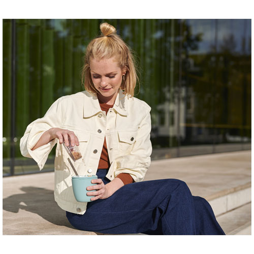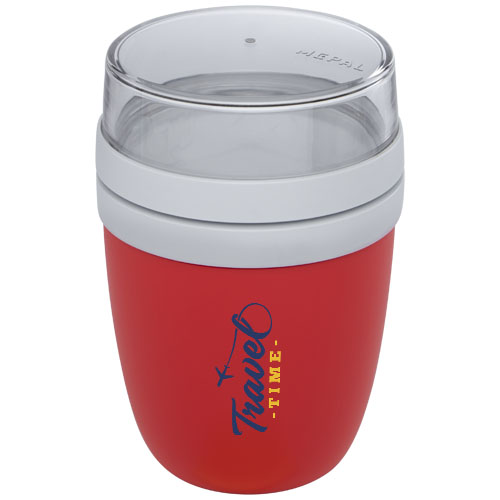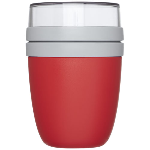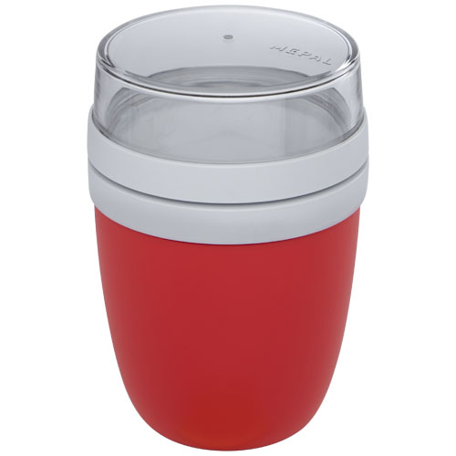 Pojemnik na lunch z dwiema komorami, aby oddzielenie przechowywać różne składniki. Oba pojemniki mają oddzielne pokrywy i dlatego pozostają czyste. Pojemność górnego przezroczystego pojemnika wynosi 200 ml, co oznacza, że może pomieścić około 75 gramów żywności w formie stałej. Pojemność dolnego pojemnika wynosi 500 ml. Wykonane z trwałego materiału, dzięki czemu mogą być przechowywane w zamrażarce oraz stosowane w kuchence mikrofalowej (należy zdjąć pokrywę) i zmyw