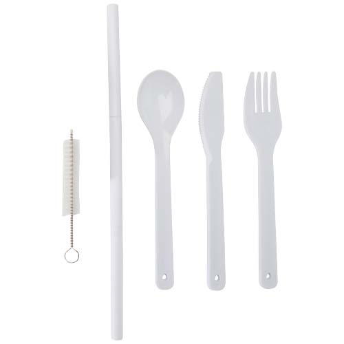 Zestaw sztućców wielokrotnego użytku z bambusową pokrywką, zawierający: widelec, nóż, łyżkę, słomkę i szczoteczkę do słomki – idealny do posiłków w podróży. Kompaktowy i łatwy do czyszczenia, doskonale nadaje się do pudełek na lunch, w podróży lub do użytku w biurze.
