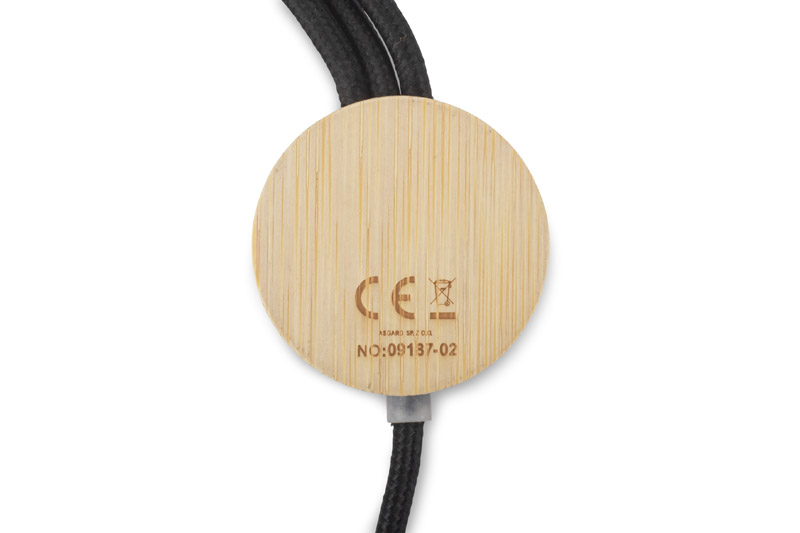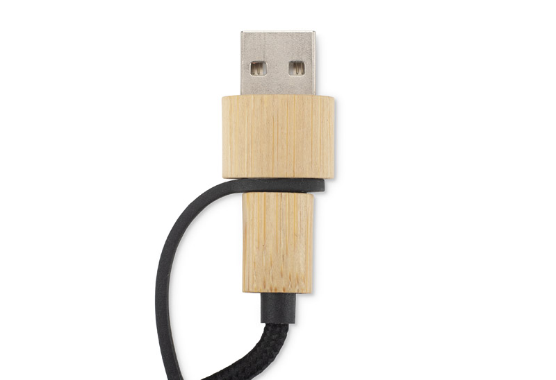GLOWIK to uniwersalny kabel ładujący 4w1 z wykończeniem z bambusa i miejscem na znakowanie. Wyposażony w cztery złącza: USB-A, 2x USB-C, micro USB oraz Lightning, umożliwia ładowanie różnych urządzeń z mocą do 15W (5V/3A). Przewód jest pokryty trwałym oplotem, a okrągły element z bambusowym wykończeniem kryje panel do znakowania – po wykonaniu graweru logo podświetla się białym światłem LED.