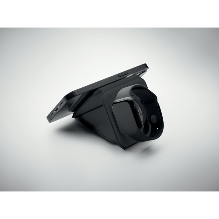 Składana stacja ładująca 3 w 1 z ABS. Posiada 3 punkty ładowania bezprzewodowego (15W). Wejście: 2 w 1 Type-C i Type-A.