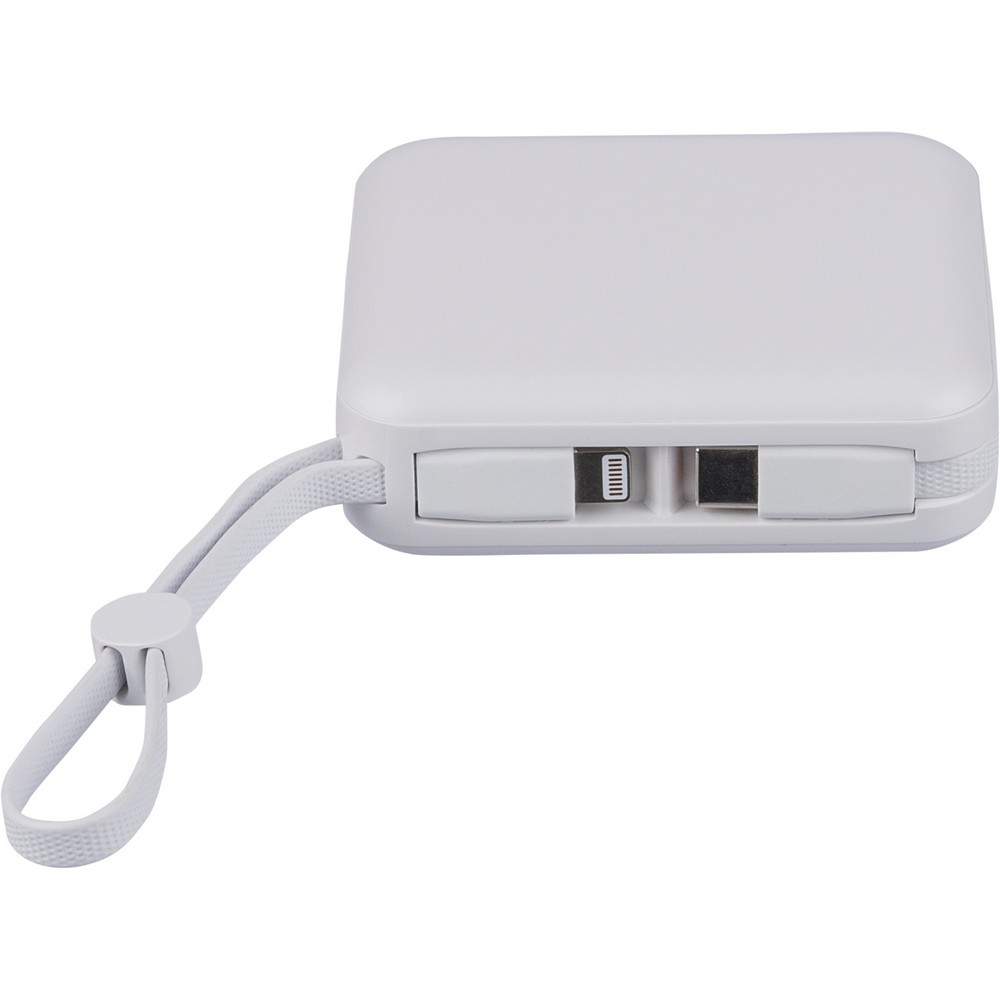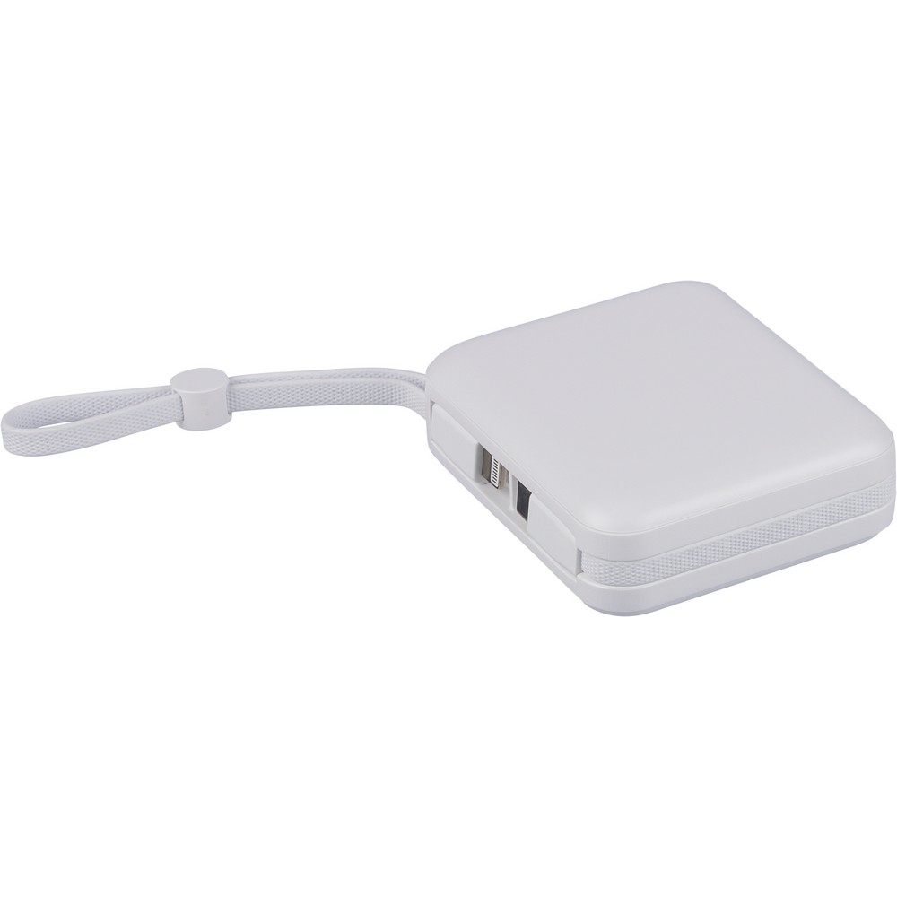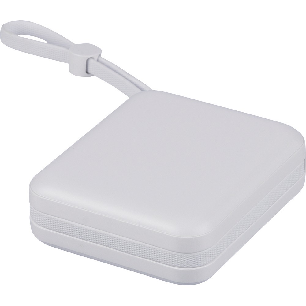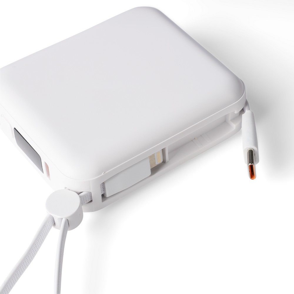 Power bank 10000 mAh, 22,5W, zestaw zawiera sznurek do przenoszenia z TPE (zintegrowany z obudową), który pełni również funkcję kabla do ładowania (USB-C i z końcówką kompatybilną z urządzeniami iOS), wskaźnik poziomu baterii na górnej części urządzenia, ikona RABS na produkcie, wejście i wyjście USB-C, wejście USB-A, w środku pudełka bibułka ochronna, bez woreczka foliowego, zawiera zabezpieczenia przed przegrzaniem, zwarciem, przepięciem i przeciążeniem prądowym, pak