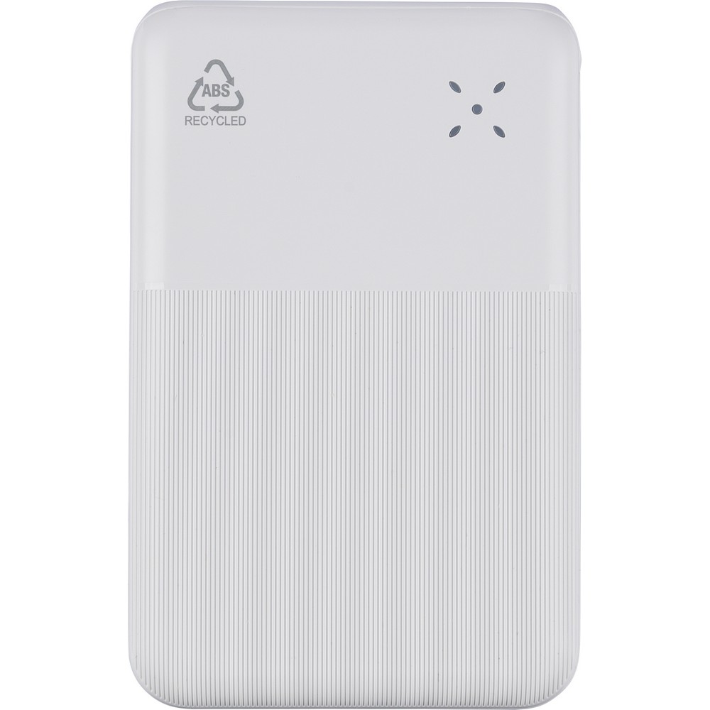 Power bank o mocy 22,5W i pojemności 20000 mAh z baterią litowo-jonową, wejście i wyjście typu C, wejście typu A, etykieta informacyjna z tyłu, ikona RABS na produkcie, posiada zabezpieczenie przed przegrzaniem, zwarciem, przepięciem i przeciążeniem, zapakowany pojedynczo w brązowe kartonowe pudełko, produkt wykonany z ABS z recyklingu