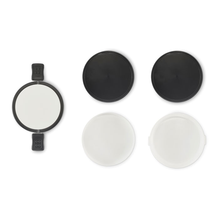 Dwupoziomowy okrągły lunchbox z polipropylenu (PP) z bocznym zatrzaskiem, uchwytami i wewnętrznymi pokrywkami. Górna pojemność 250 ml, dolna 700 ml. Doskonały jako reklamowy pojemnik na obiad z nadrukiem full color oraz praktyczne naczynie reklamowe dla branży gastronomicznej, idealny do przenoszenia świeżych posiłków.