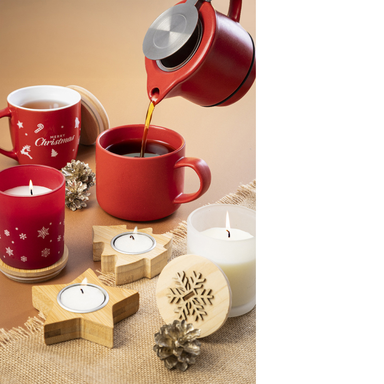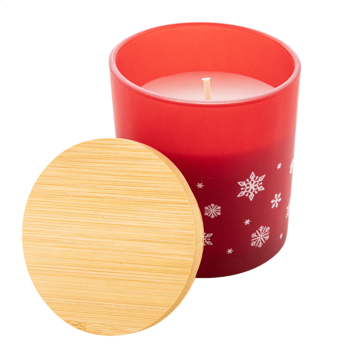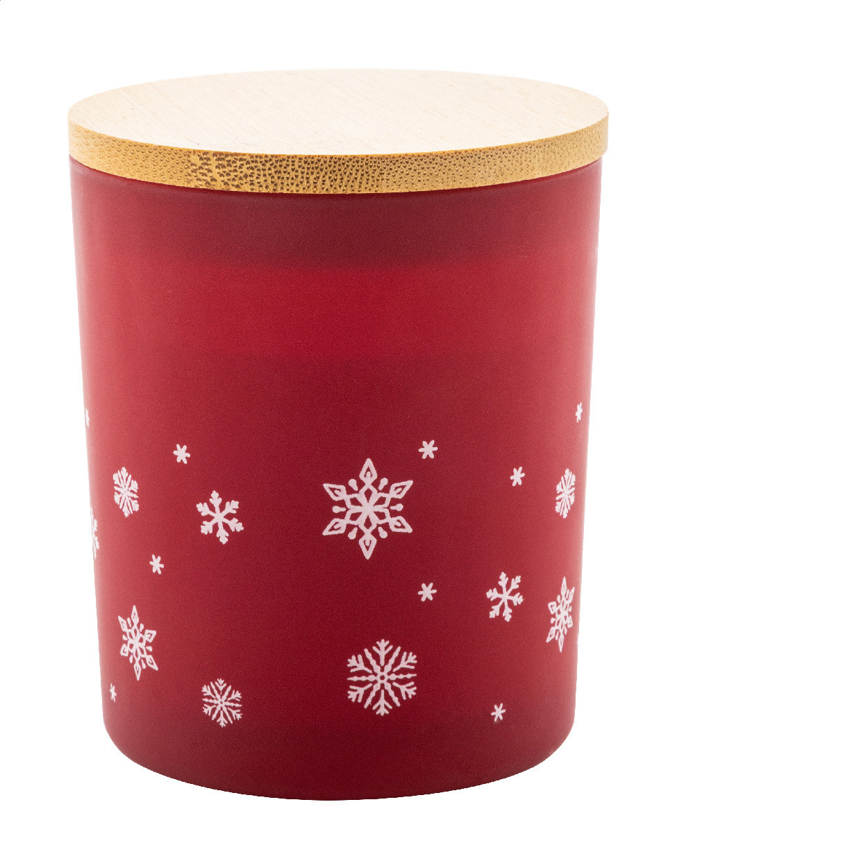 Elegancka świeca świąteczna w matowym szkle z bambusową pokrywką i dekoracyjnym płatkiem śniegu. Wykonana z naturalnego wosku roślinnego, zapakowana w ekologiczne pudełko kraft. Możliwość nadruku lub graweru czyni ją idealnym reklamowym prezentem świątecznym dla pracowników, klientów i partnerów biznesowych.