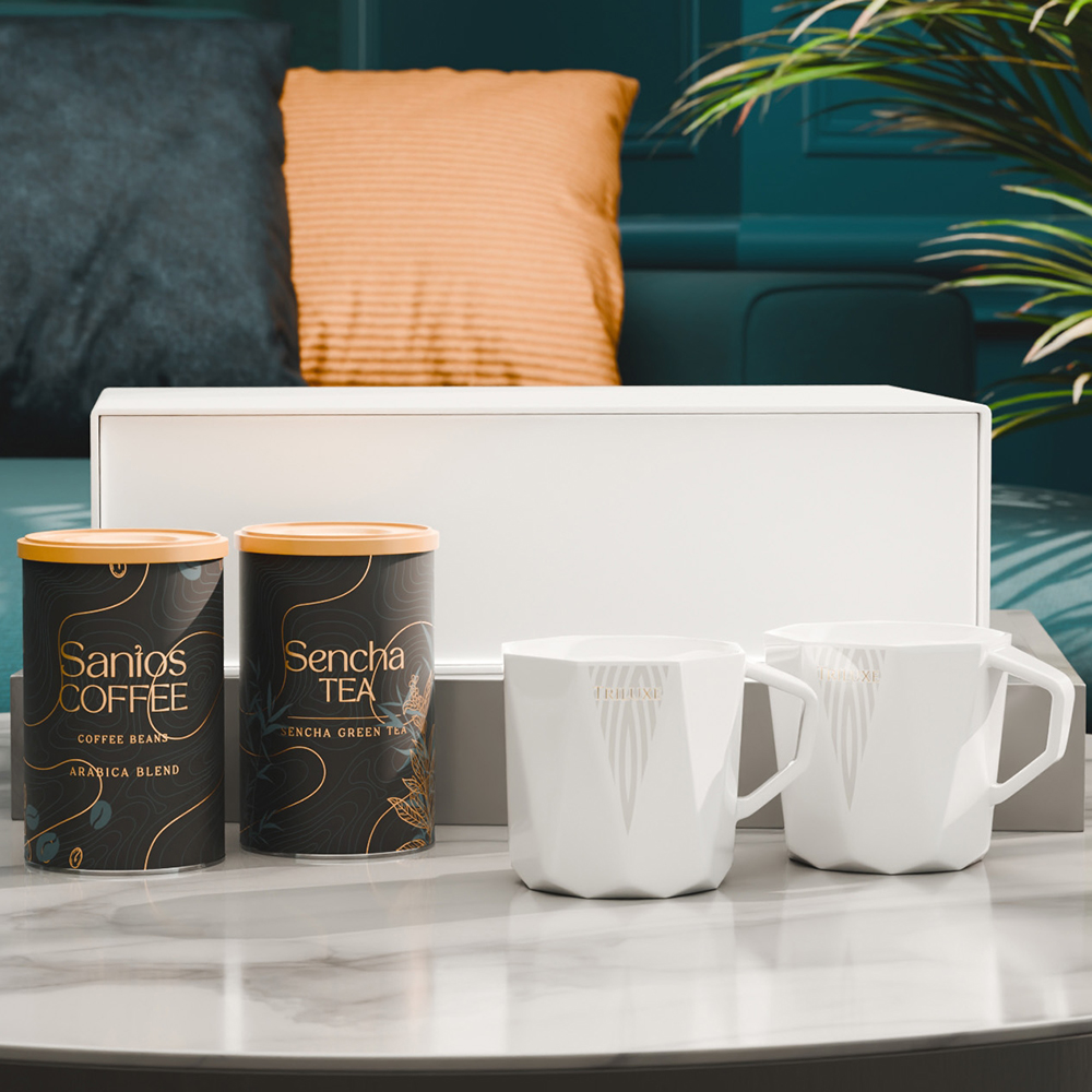 Każdy element zestawu – kubki, puszki z kawą i herbatą, a nawet opakowanie – może zostać spersonalizowany w taki sposób, aby tworzyć spójny i harmonijny przekaz. Dzięki temu marka jest obecna w sposób nienachalny, ale trwały i zapamiętywalny.
