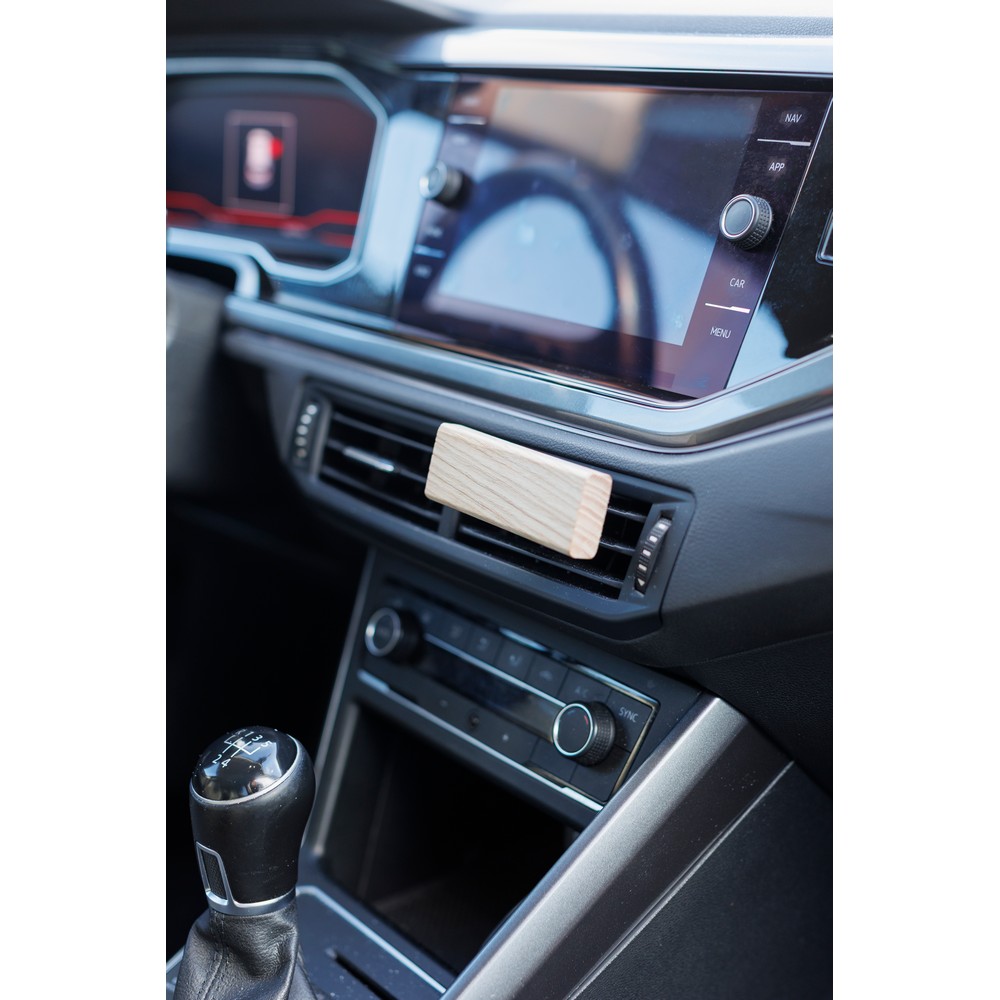 Odświeżacz do samochodu, 2 pojemniczki z zapachem drzewa sandałowego po 3 g, klips ułatwiający przypięcie w samochodzie, zapakowany pojedynczo w brązowy kartonik, produkt wykonany z drewna bukowego