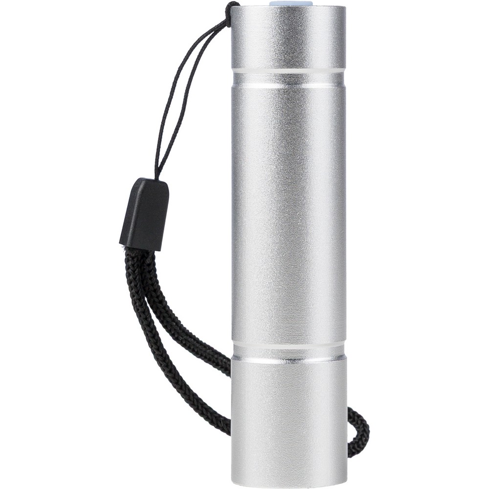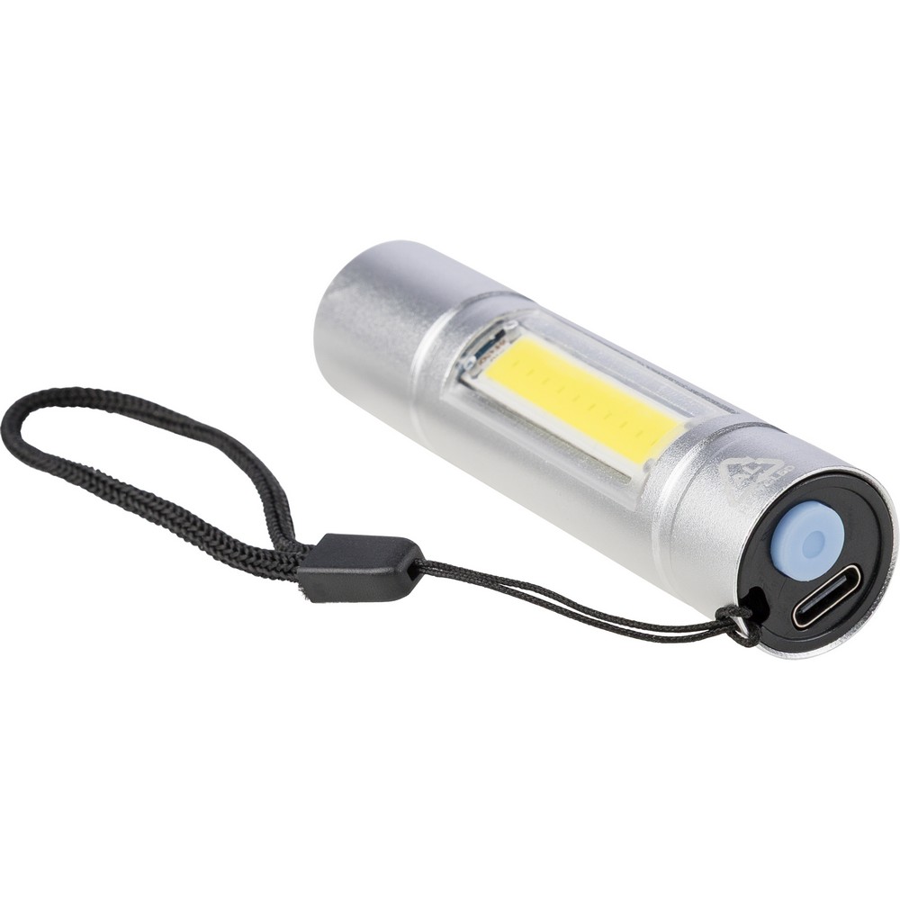 Latarka COB, 3 tryby świecenia, 80-100 lumenów, opaska na nadgarstek, ikona recyklingu na produkcie, funkcja ładowania, port USB-C, bateria 300 mAh, czarny kabel 30 cm w komplecie, zapakowana pojedynczo w brązowy kartonik, produkt wykonany z aluminium z recyklingu i poliestru