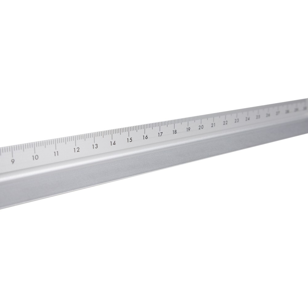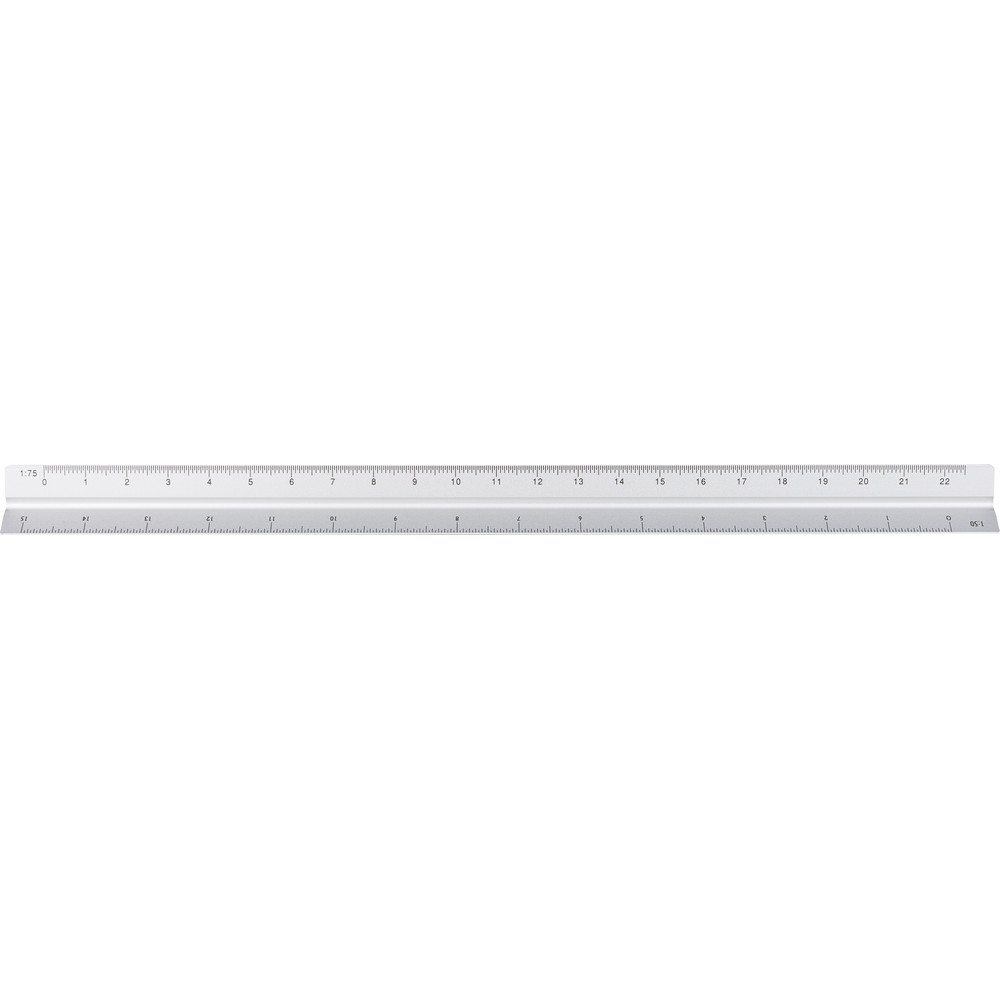 Linijka trójkątna 30 cm z różnymi skalami: 1:20, 1:25, 1:50, 1:75 , 1:100, pakowana pojedynczo w brązowe kartonowe pudełko z ilustracją, produkt wykonany z aluminium