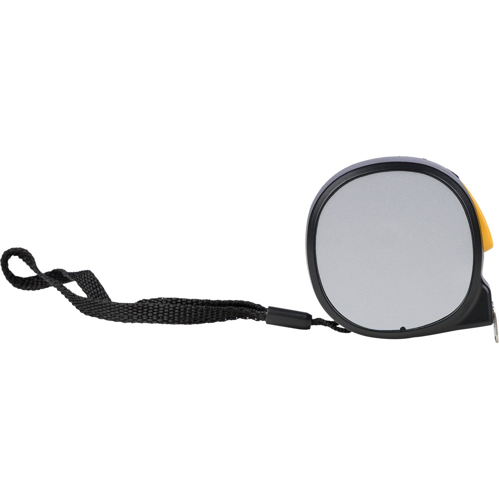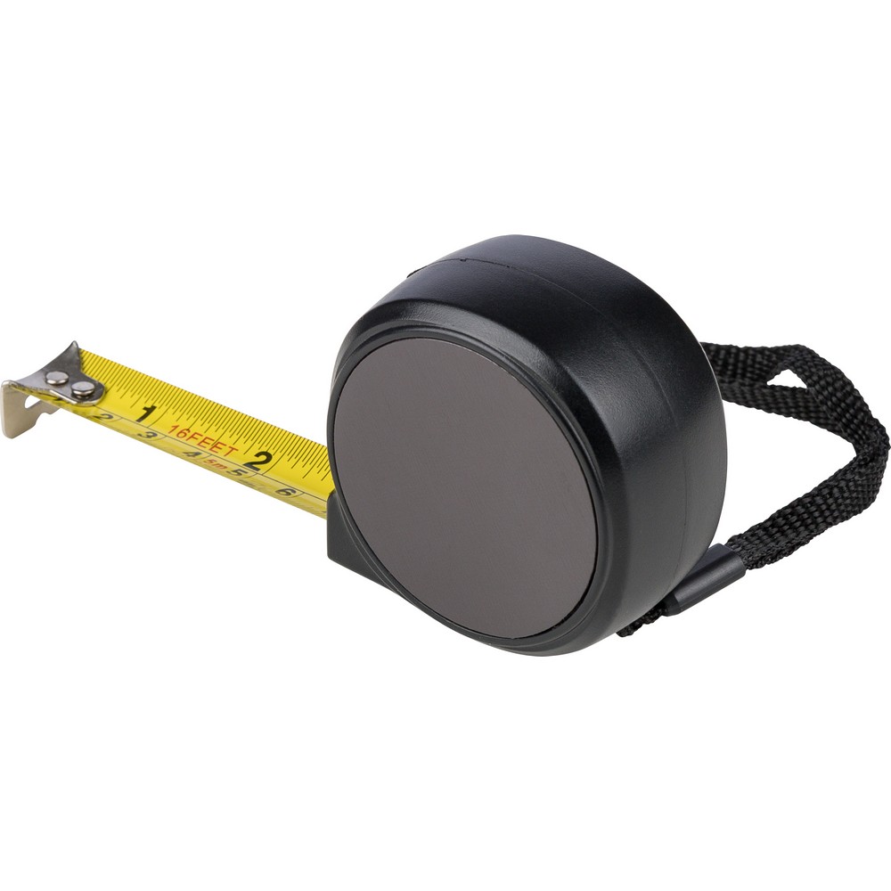 Miarka magnetyczna o długości 5 metrów, cale i centymetry, przycisk na wierzchu zwalniający blokadę, opaska na nadgarstek, zapakowana pojedynczo w brązowy kartonik, produkt wykonany z ABS, metalu i poliestru