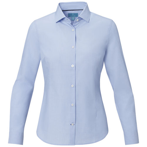 Przyjazna dla środowiska odzież promocyjna. Kołnierz półokrągły. Perłowe guziki z logo. Regulowany mankiet z pojedynczą plisą. Satynowa lamówka wewnątrz kołnierzyka. Kontrastowe przeszycia na plisie rękawowej i dolnej plisie z dziurką od guzika. Tkana metka.