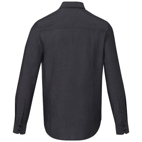 Przyjazna dla środowiska odzież promocyjna. Kołnierz półokrągły. Perłowe guziki z logo. Regulowany mankiet z pojedynczą plisą. Satynowa lamówka wewnątrz kołnierzyka. Kontrastowe przeszycia na plisie rękawowej i dolnej plisie z dziurką od guzika. Tkana metka.
