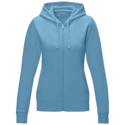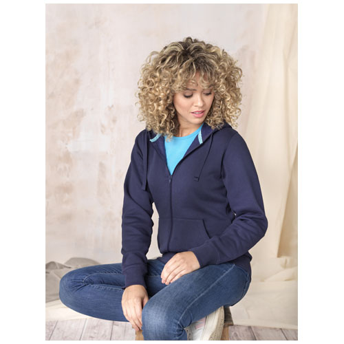 Przyjazna dla środowiska odzież promocyjna. Zamek błyskawiczny z certyfikatem GRS. Sznurek w kapturze z certyfikatem GOTS. Dopasowana talia dla lepszego wyglądu. Kieszeń kangurka. Meszek po wewnętrznej stronie. Mankiety z płaskiej dzianiny ściągaczowej. Płaski splot ściągaczowy na dole. Dwukolorowa taśma wzmacniająca w kołnierzyku z brandingiem. Półksiężyc. Metka wdrukowana transferem dla lepszego komfortu.