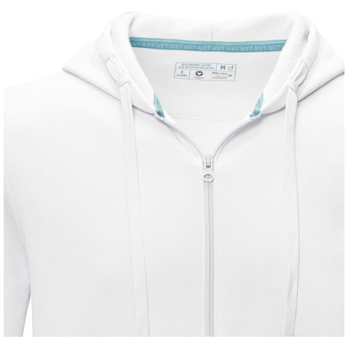 Przyjazna dla środowiska odzież promocyjna Zamek błyskawiczny z certyfikatem GRS. Sznurek w kapturze z certyfikatem GOTS. Kieszeń kangurka. Meszek po wewnętrznej stronie. Mankiety z płaskiej dzianiny ściągaczowej. Płaski splot ściągaczowy na dole. Dwukolorowa taśma wzmacniająca w kołnierzyku z brandingiem. Półksiężyc. Metka wdrukowana transferem dla lepszego komfortu.