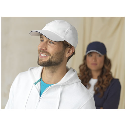 Czapka Morion 6 panel cool fit jest wykonana z mikrofibry poliestrowej z recyklingu o gramaturze 110 g/m² z certyfikatem GRS i ma wstępnie zakrzywiony daszek o konstrukcji kanapkowej, dodający klasycznego charakteru. Tylne panele mają laserowo wycięte otwory dla optymalnej wentylacji, zapewniając Ci chłód i wygodę podczas aktywności na świeżym powietrzu. Zaprojektowany z myślą o wygodnym dopasowaniu do obwodu głowy 58 cm, zapięcie na metalową klamrę umożliwia łatwą i bezpiec